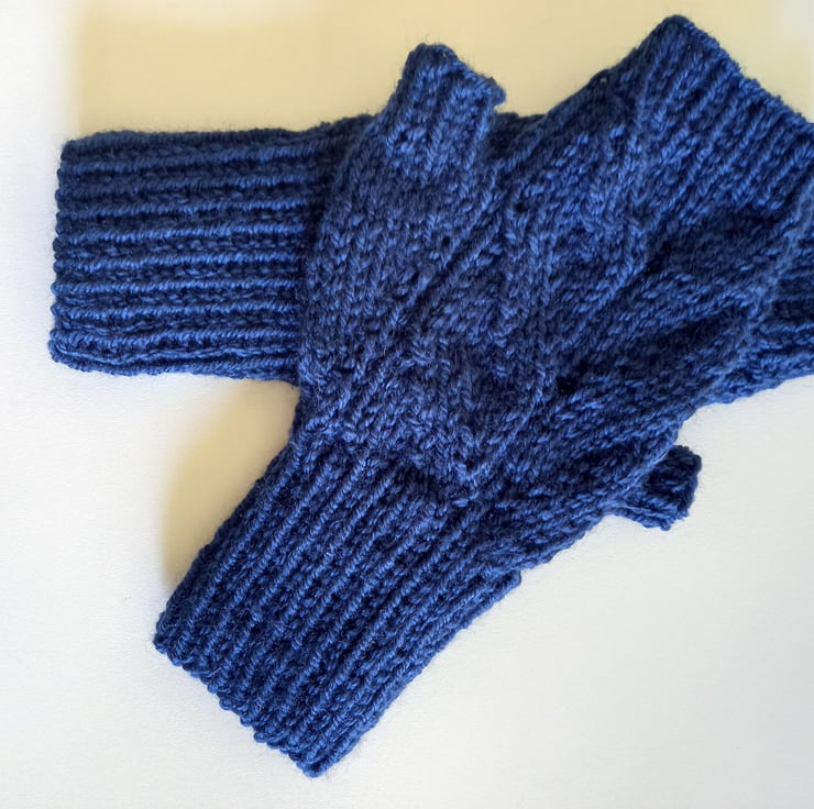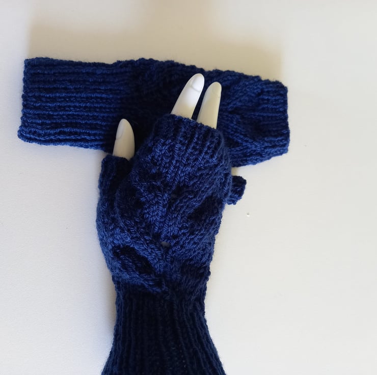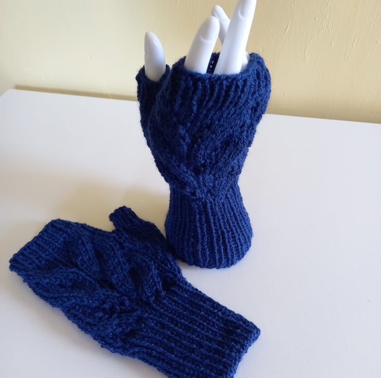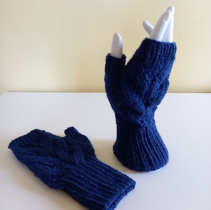 Lovingly handmade in the beautiful Lincolnshire Wolds, where walking and the outdoors are an integral part of life, these pretty Fingerless Gloves have been hand knitted seamlessly using a premium quality, dark blue, double knitting yarn.