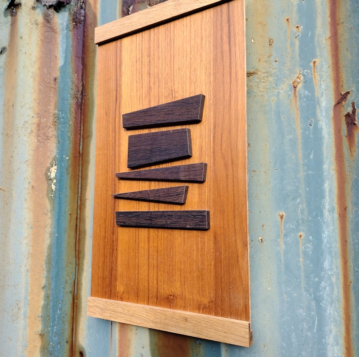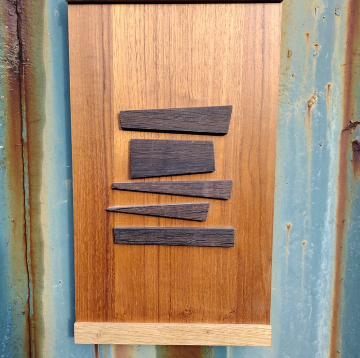 This mid century inspired wall hanging has been hand made using plywood reclaimed from vintage furniture, and hardwood offcuts to form a geometric design.