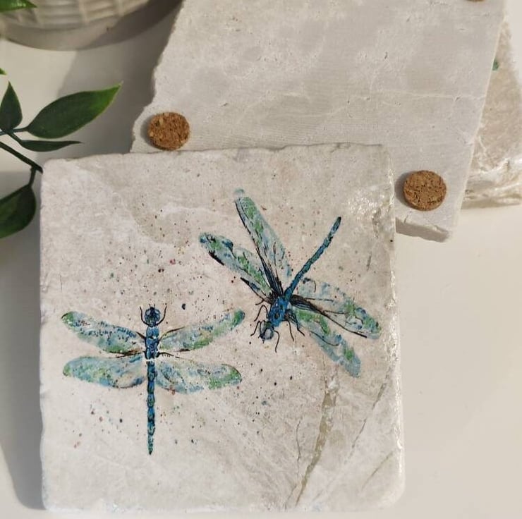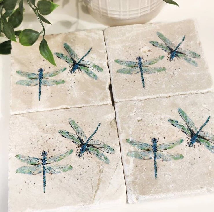 Coasters are each 10 x 10 cm, hand decorated with a gorgeous image of Dragonflies on each one.