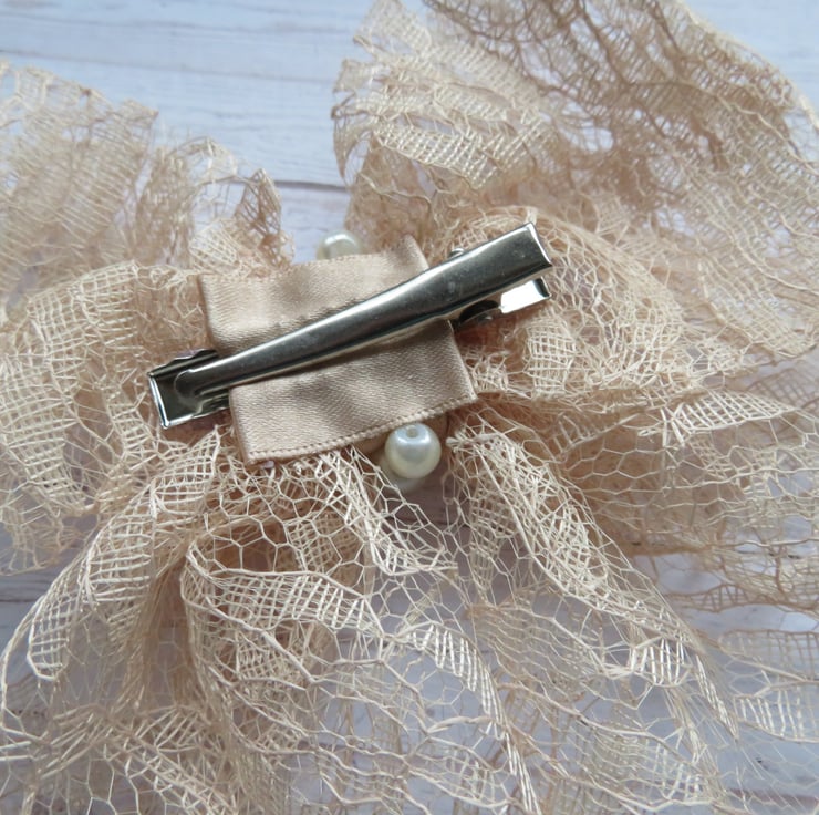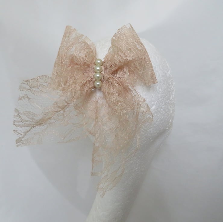 Finished with a nude satin ribbon centre with a line of ivory pearls and attached into the hair with a small metal croc hair clip across the back.