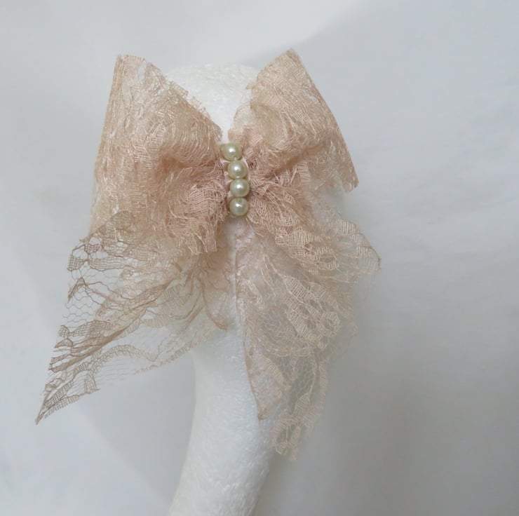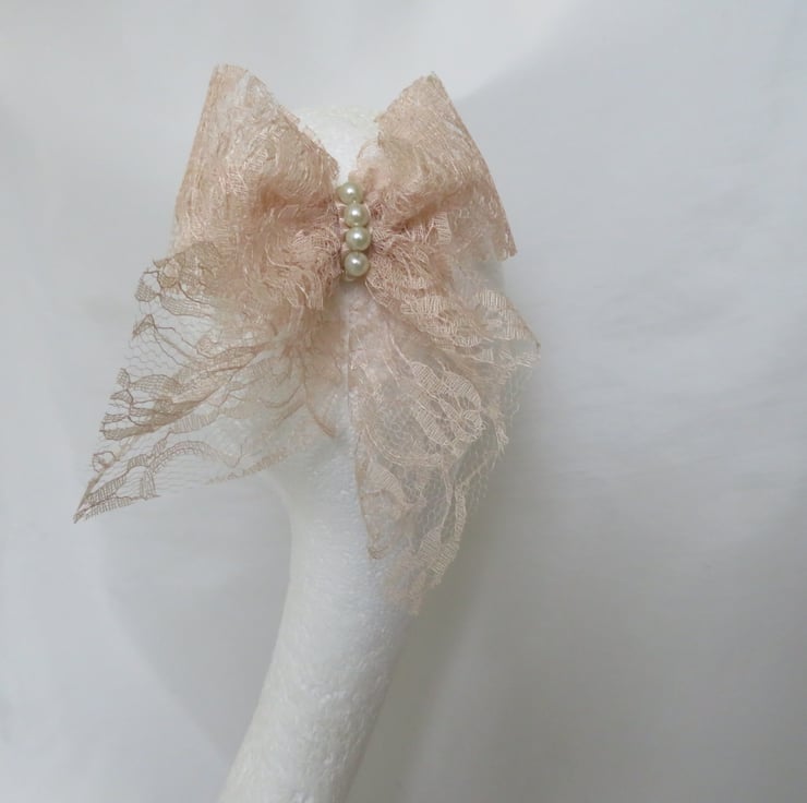 Created with handcrafted single loop bow with pretty shaped tails made with stiffened lace fabric.