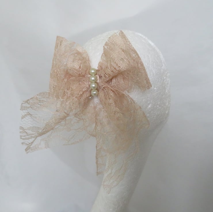 Finished with a nude satin ribbon centre with a line of ivory pearls and attached into the hair with a small metal croc hair clip across the back.