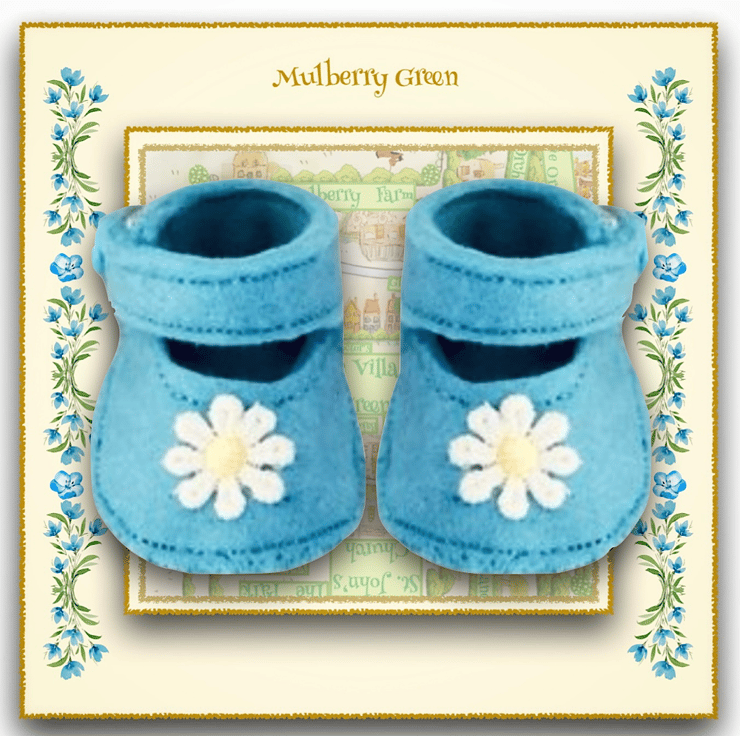 A lovely little pair of pale blue shoes, decorated with daisies, to fit the Mulberry Green characters. They fasten with a little popper underneath a button.