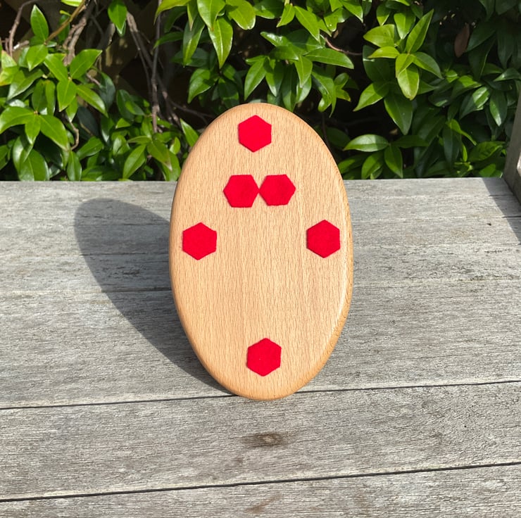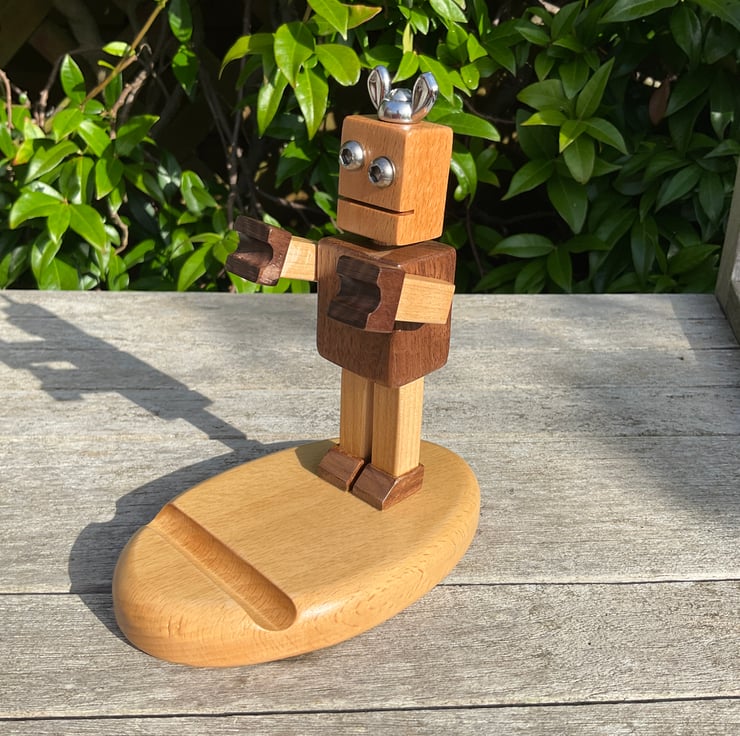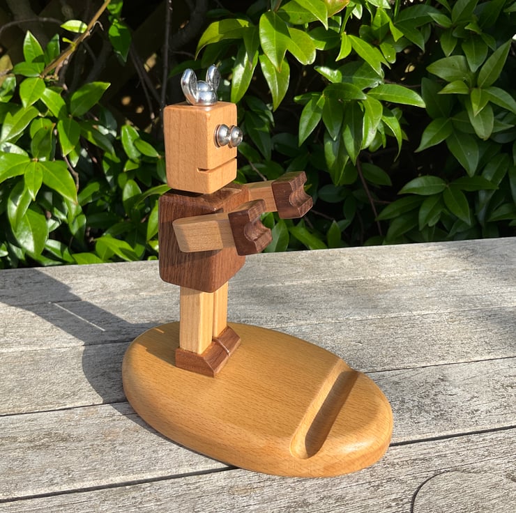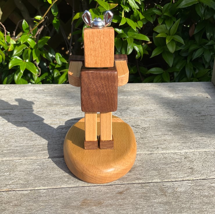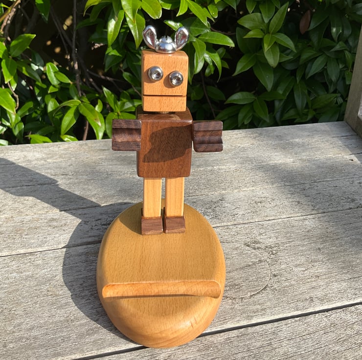 The robot is made from walnut (dark wood), maple (light wood) and its features made from a variety of ironmongery. The beechwood base has red felt feet attached to the under side. All the edges are rounded & smoothed the stand finished to a deep satin sheen.