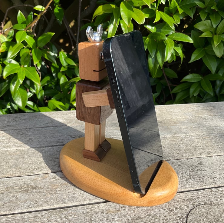 This cute junkyard robot phone stand makes a unique and very practical gift. The stand supports your phone at a convenient angle on a desk or bedside table for chats or video calls. The stand is designed to cater for small or larger phones, the pictures indicate iphone (147x72x8mm).
