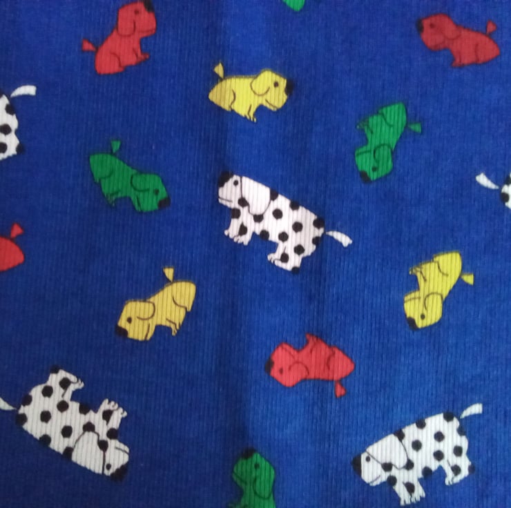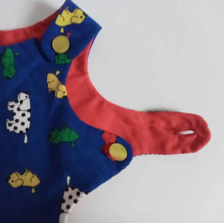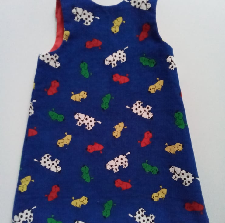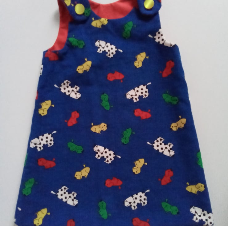 A line style dress/pinafore in needlecord with a fun dog design. This dress can be worn by itself or with a long sleeve t shirt as a pinafore, teamed with warm tights and a cardigan for colder days.
