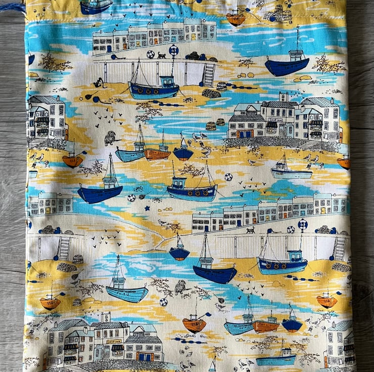 A gorgeous yellow and blue coastal themed print was used to make this cheerful drawstring bag which measures approximately 31cm x 25cm.
