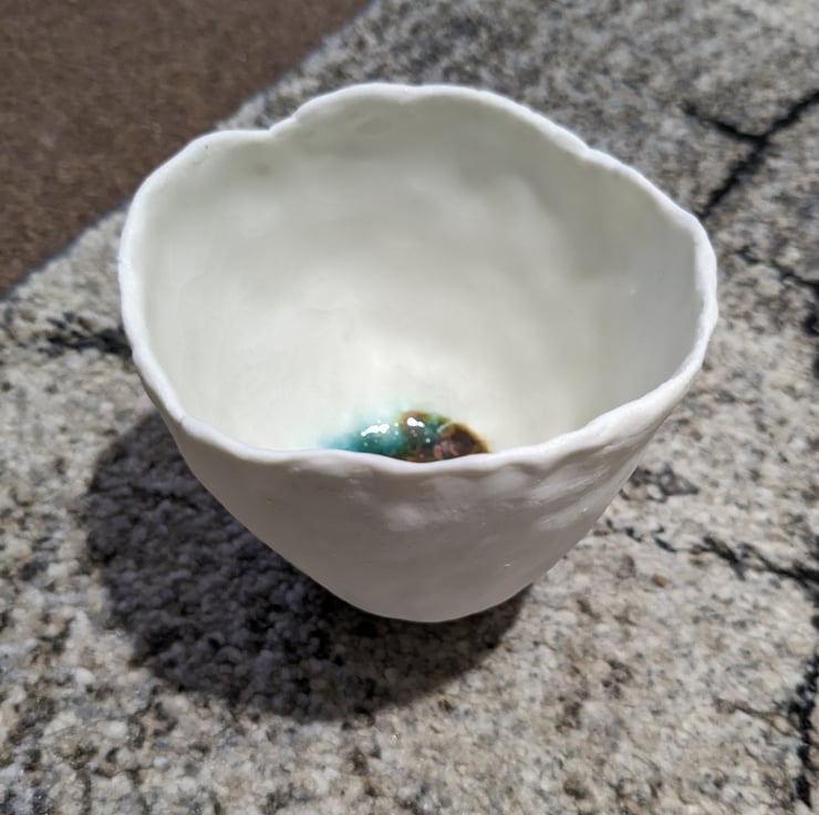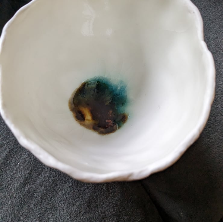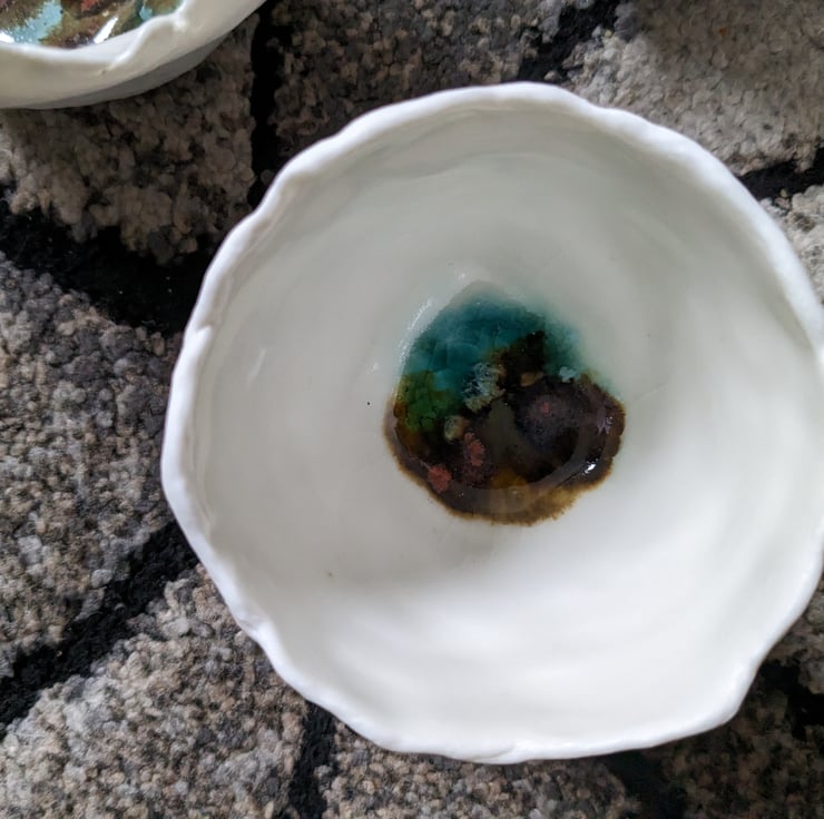 Mixed splashes of different coloured Glaze in the centre with clear glaze over, only on the inside. Approx 10 cm by 10cm. Each pot is very different in appearance, lovely handmade one off ceramics.