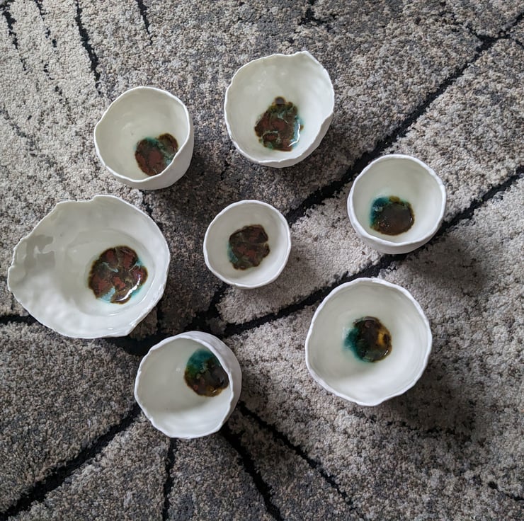 Handmade porcelain small pots with splashes of glaze.