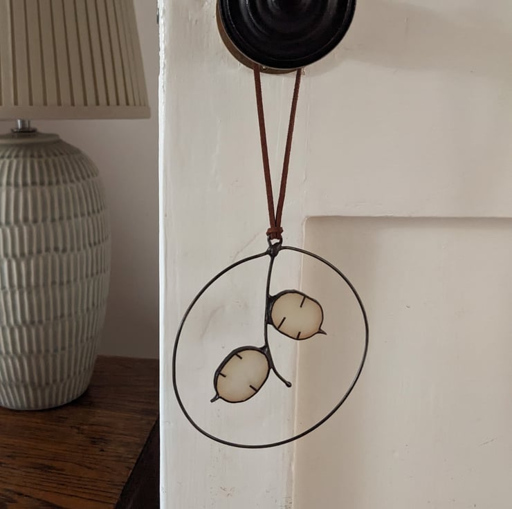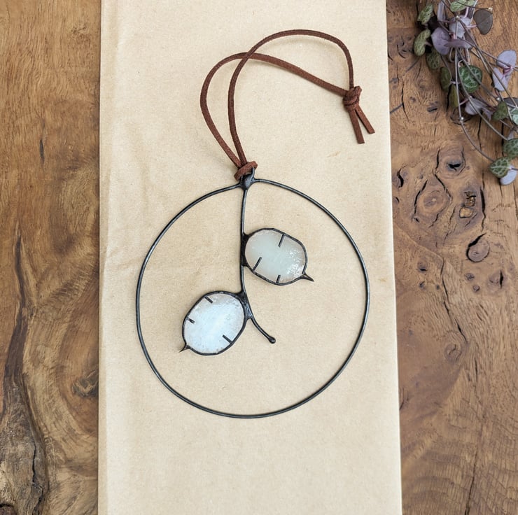 A stained glass mini wreath of Honesty (lunaria) seeds in off-white, created using the Tiffany copper foil technique.