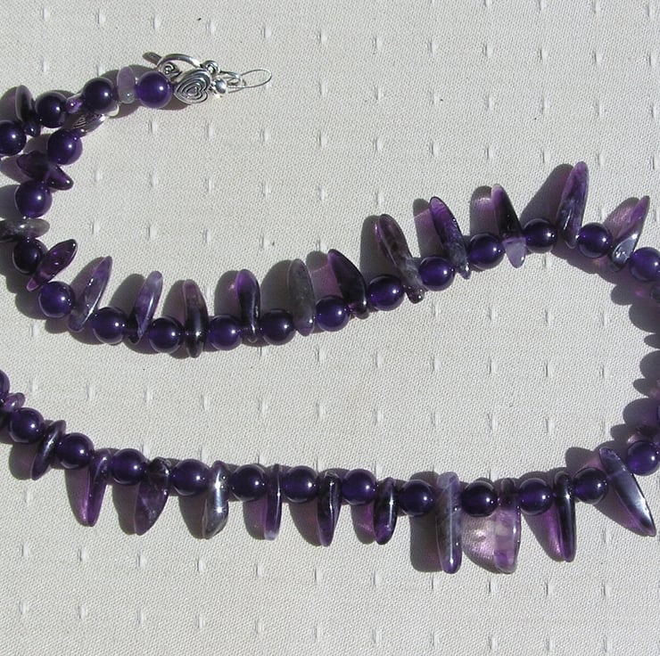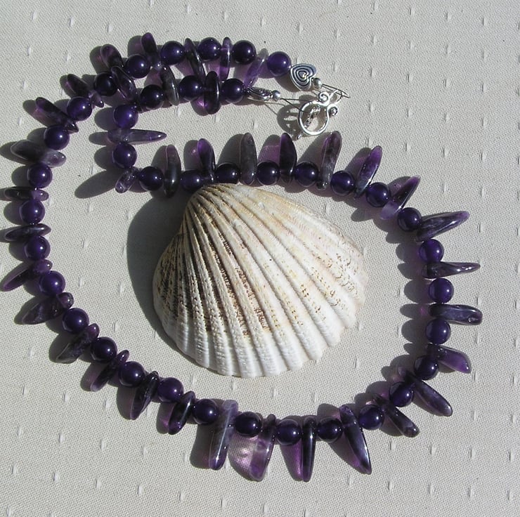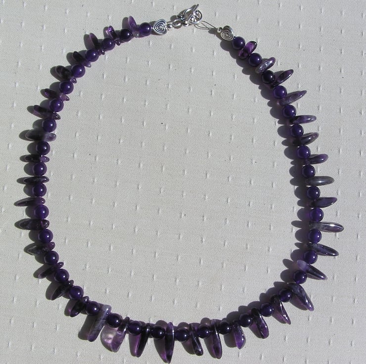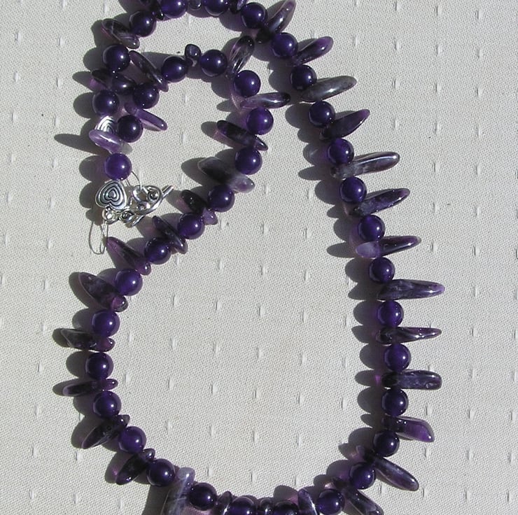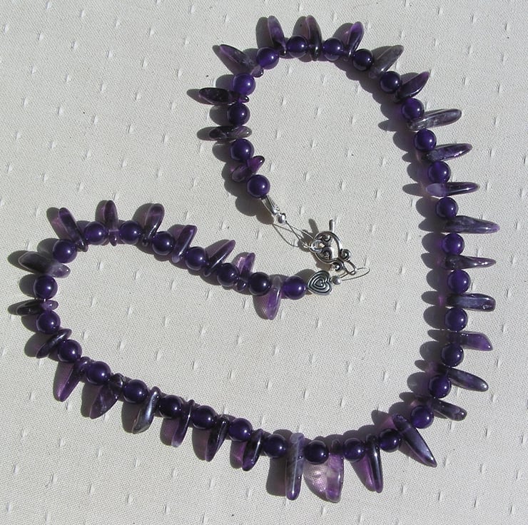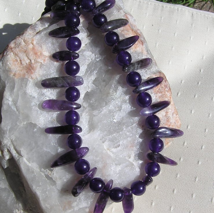 This Stunning Sumptuous Necklace is made wholly from Purple Amethyst… alternating ‘Spike’ (or teeth shaped) and 8mm round beads – a Vibrant combination that will look stunning either worn casually or with something more Elegant for a Special Evening out