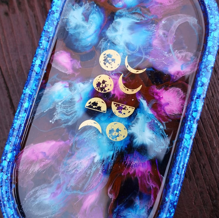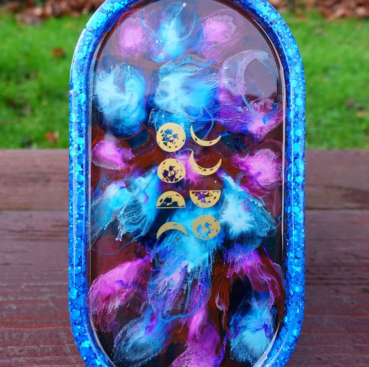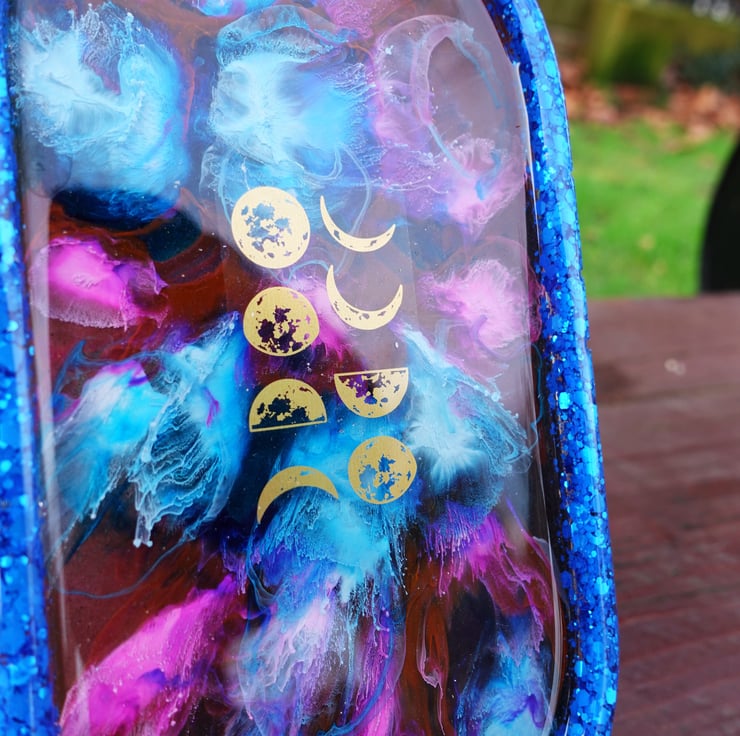 With blue chunky glitter on the borders and vibrant pink, blue and purple inside.