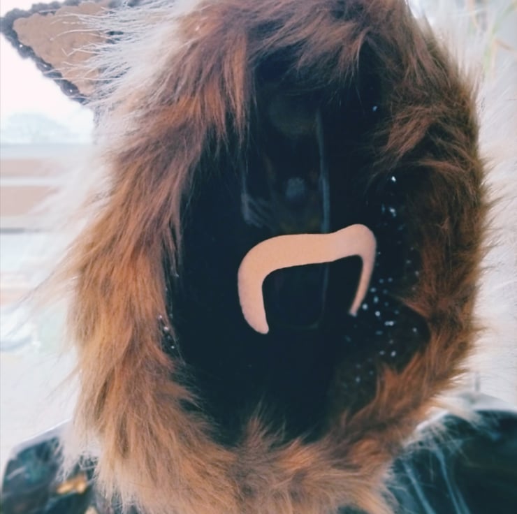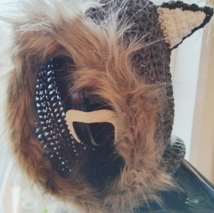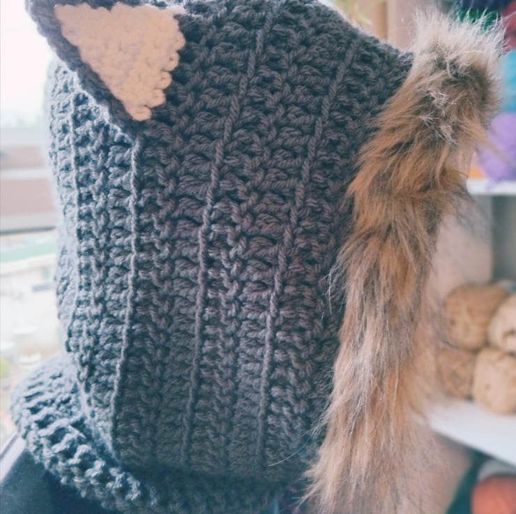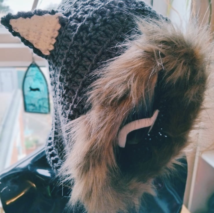 The hood has upright wolf ears lined in white and a faux fur trim around the face.
