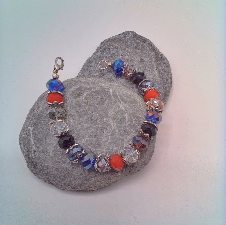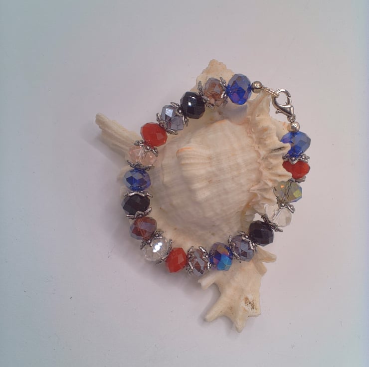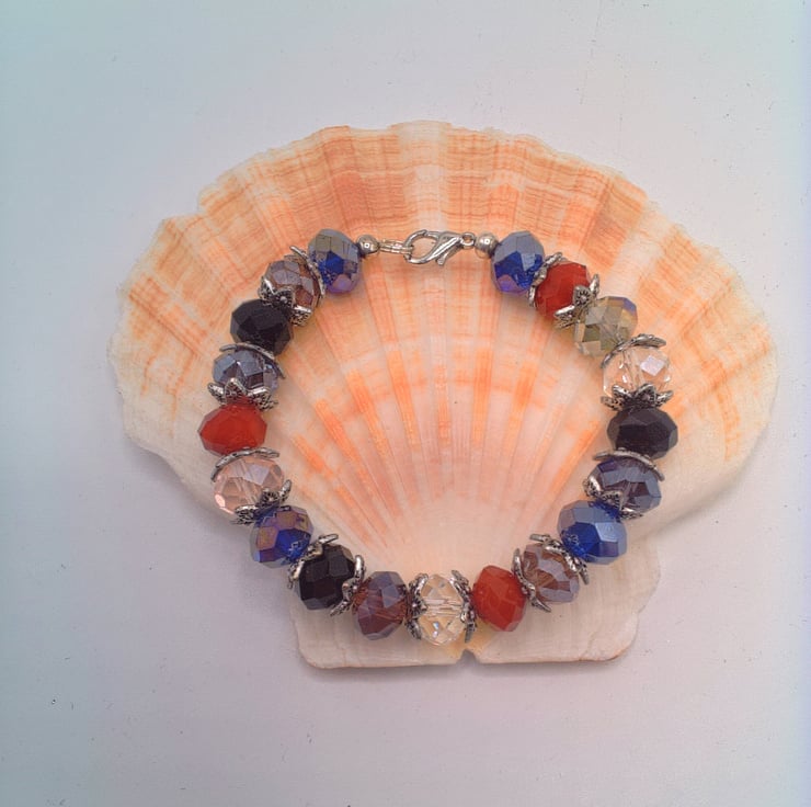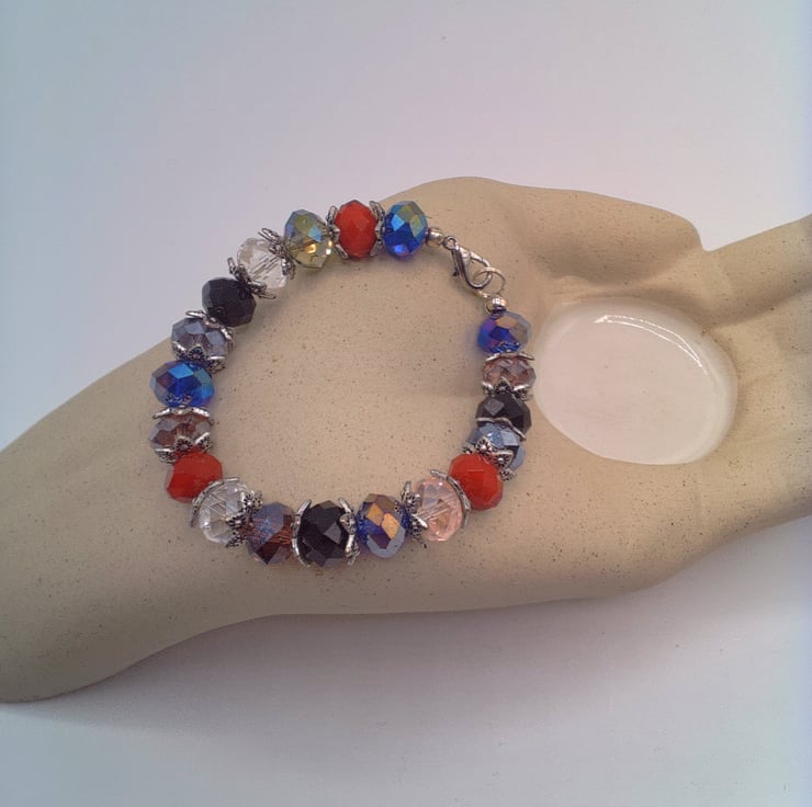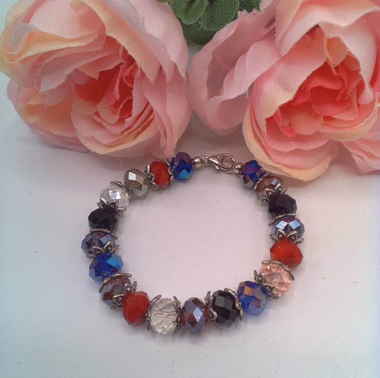 This beautiful bracelet would look great with any of your Spring and Summer outfits that you wear for a party or special occasion or for formal day wear. It would make a lovely gift for a relative or friend for a birthday, anniversary or for Christmas or a lovely treat for yourself. The bracelet is made using 10 mm x 8 mm purple, black, red, pink, smoky quartz and dark blue crystal rondelle beads with silver plated bead caps. It is fastened using a silver plated lobster clasp. The bracelet measures 6.75 inches (17 cm). The bracelet will be dispatched wrapped in tissue paper in an organza bag and delivered to you via Royal Mail first class post.