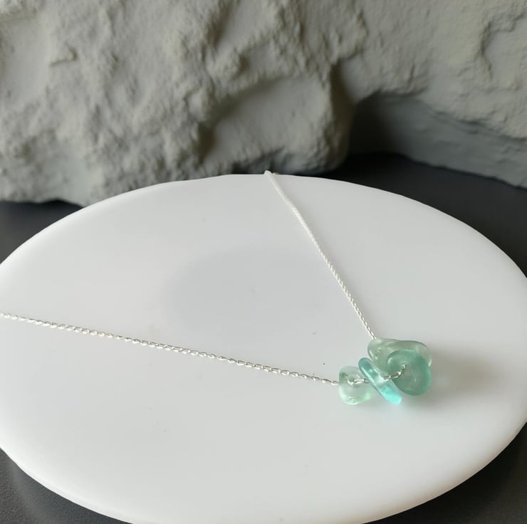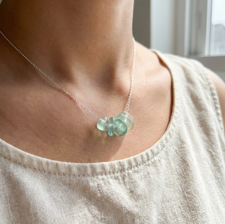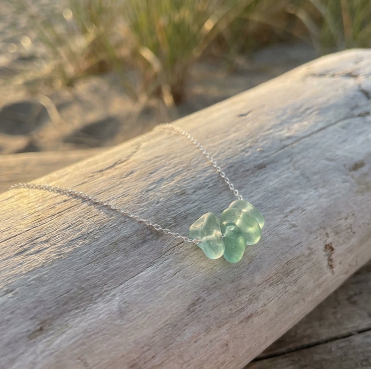 Ocean beauty with my stunning droplets of seafoam sea glass necklace. Made with 5 pieces of sea glass which I drilled and threaded the sea glass through a sterling silver chain, each necklace is one-of-a-kind. A dainty organic, bohemian style necklace that's perfect for any occaission.