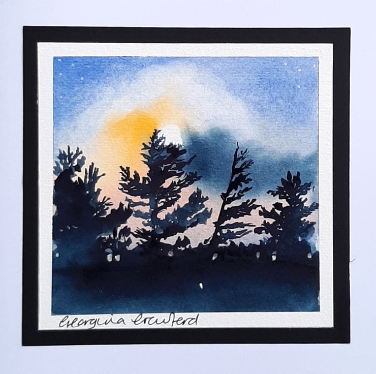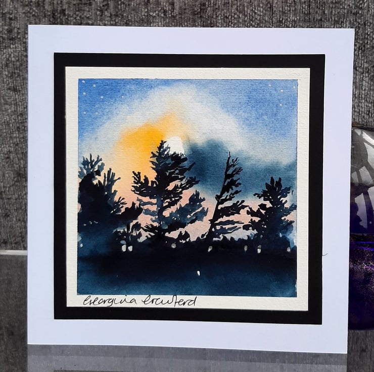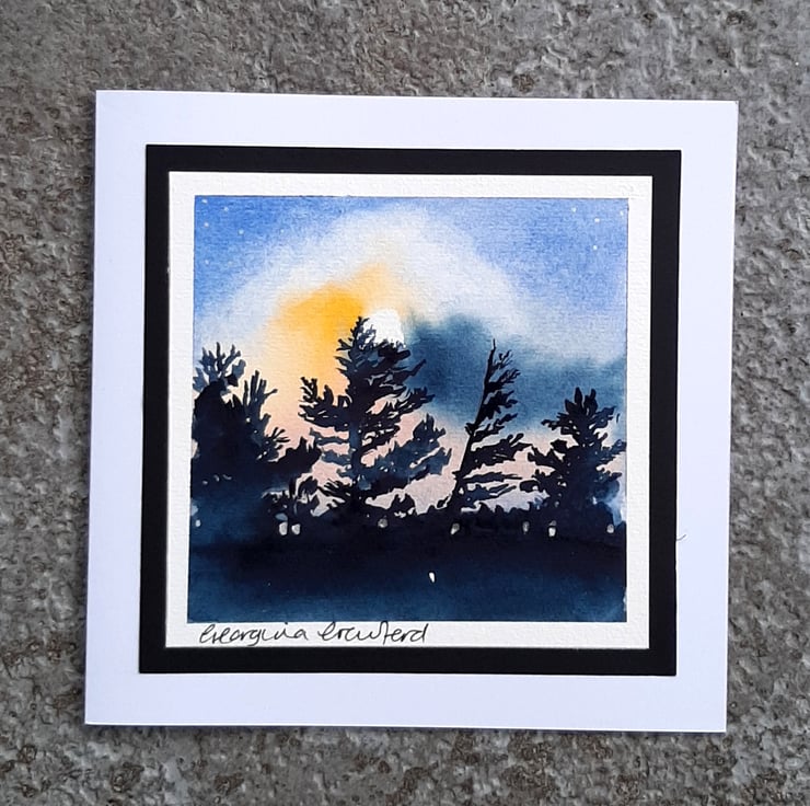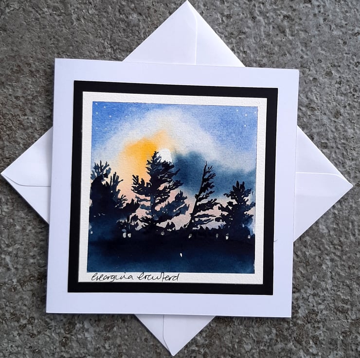 Beautiful watercolour painting made into a card of the moon with fir trees in the early morning.