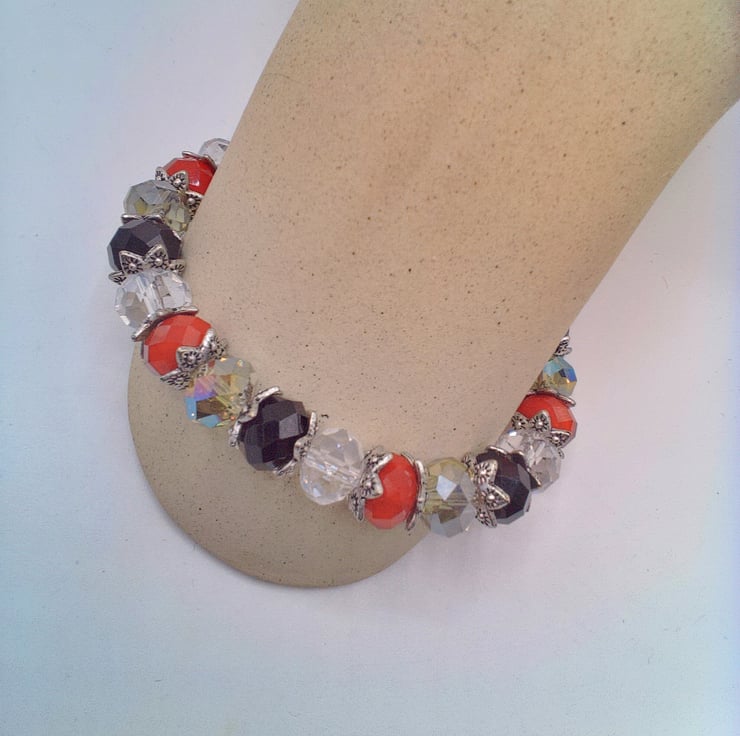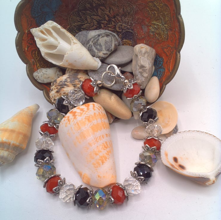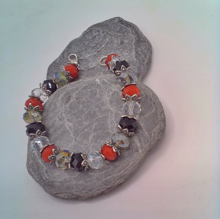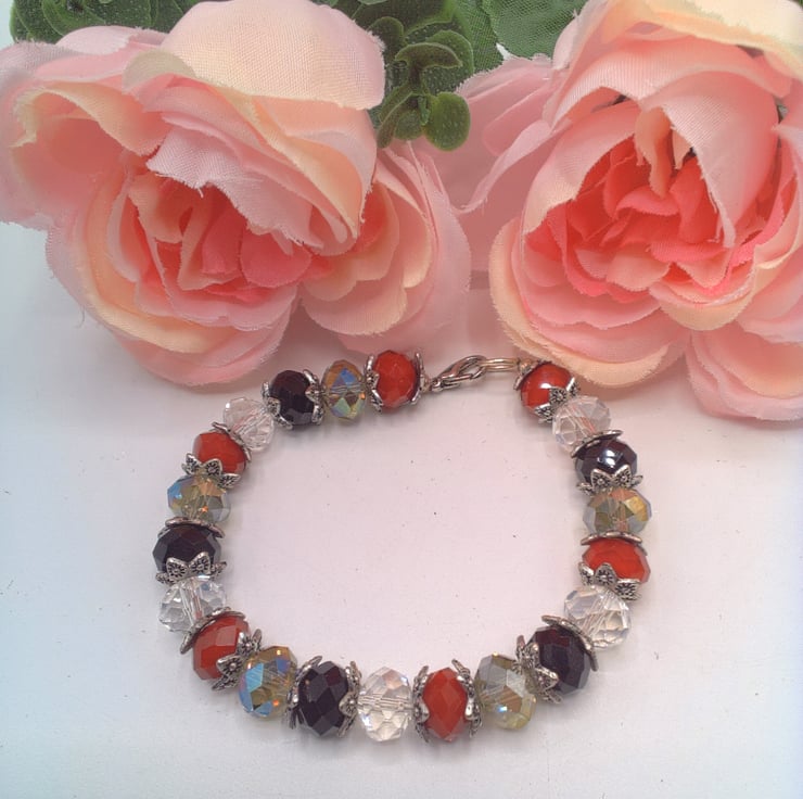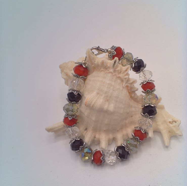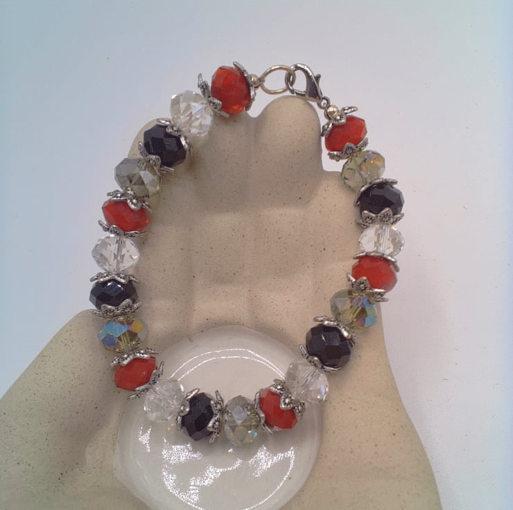 This beautiful bracelet would go with any outfit that you wear for a party or special occasion or for formal day wear. It would make a lovely gift for a relative or friend for a birthday, anniversary or for Christmas. It would also make a fitting gift for a bridesmaid or for a prom, or a lovely treat for yourself. The bracelet is made using 10 mm x 8 mm black, red and clear crystal rondelle beads with silver plated bead caps. It measures 7.5 inches (19 cm) and is fastened with a silver plated lobster clasp. The bracelet will be dispatched wrapped in tissue paper in an organza bag and delivered to you via Royal Mail first class post.