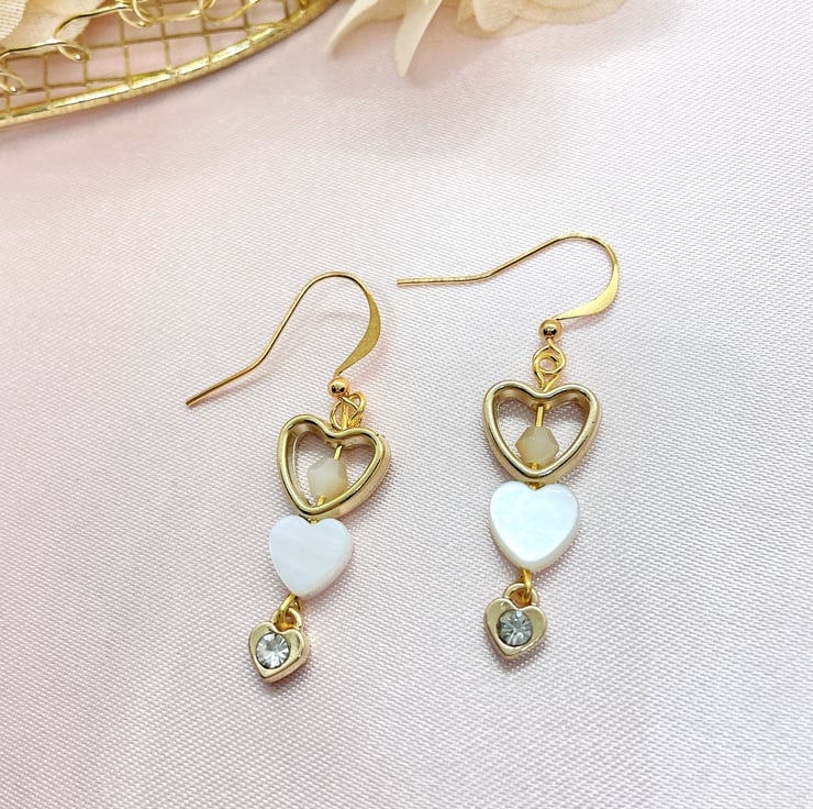 - Longest drop measurements from the ear hook attachment: crystal beads (4 cm), triple hearts (3 cm), and heart & diamond (4.5 cm)