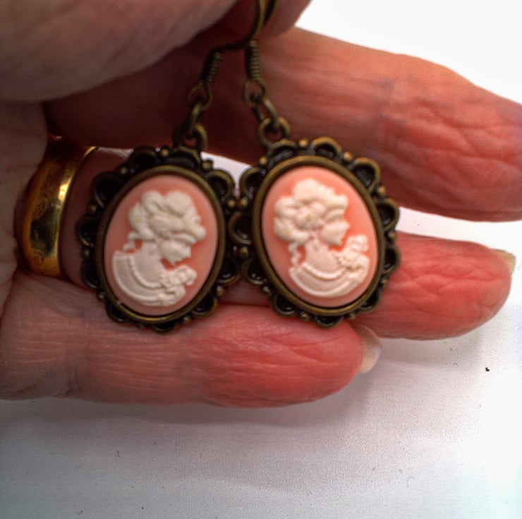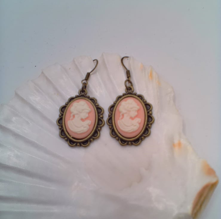 The earrings are made using an oval pink background with a white cameo cabochon on an oval bronze plated setting with a scalloped edging suspended on bronze plated hook ear wires. They have a drop of 3 cm from the base of the ear wires.