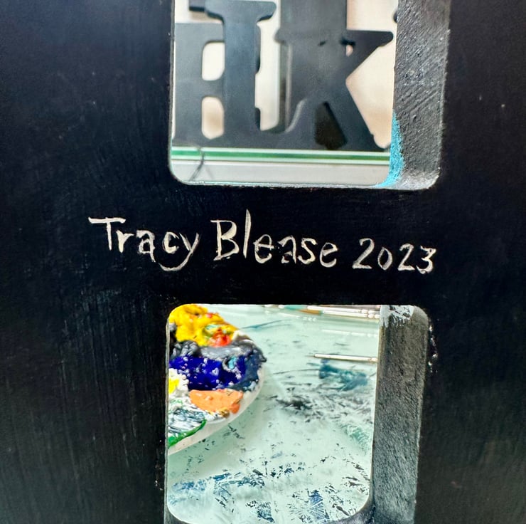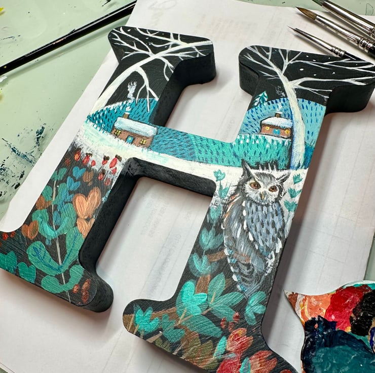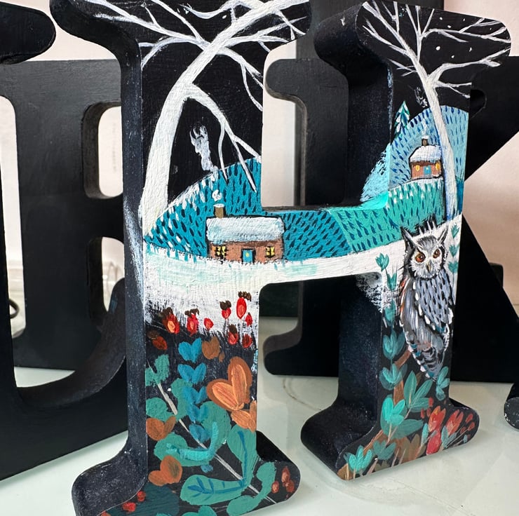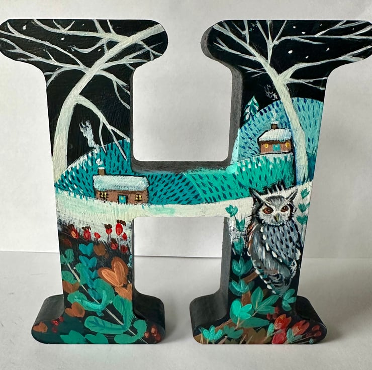 Hand painted Art Letter H. 13cm high and painted in acrylics with a scene of the winter countryside with a beautiful owl in the foreground. Each letter will be hand painted to order and design changes can be made. A custom design can be chosen including colourways and creatures or themes. This may require an additional design fee.
