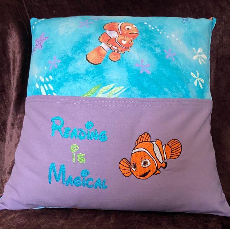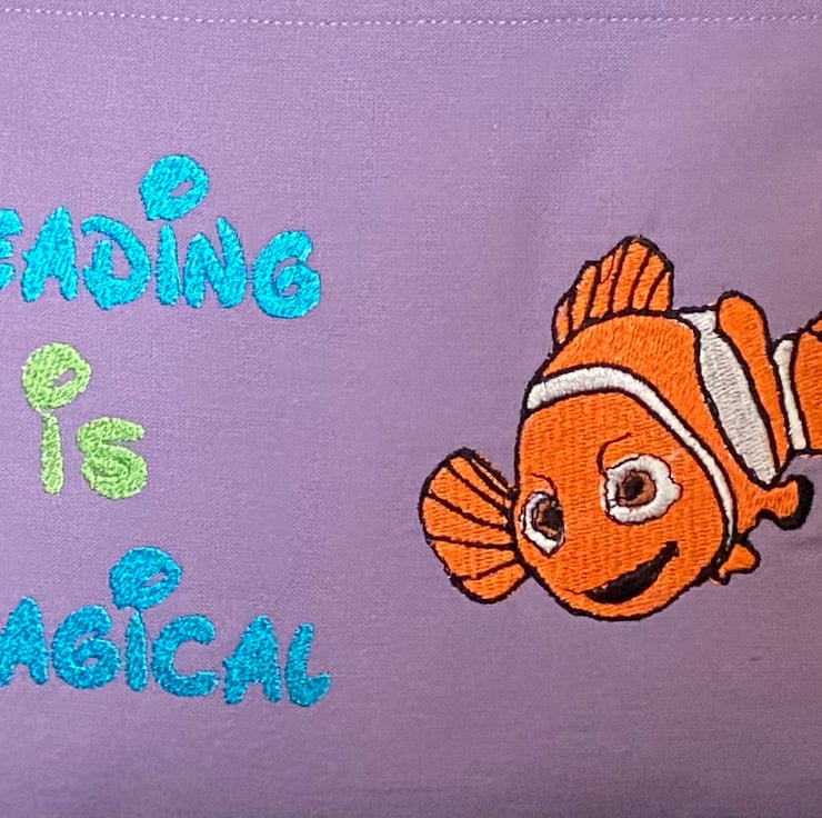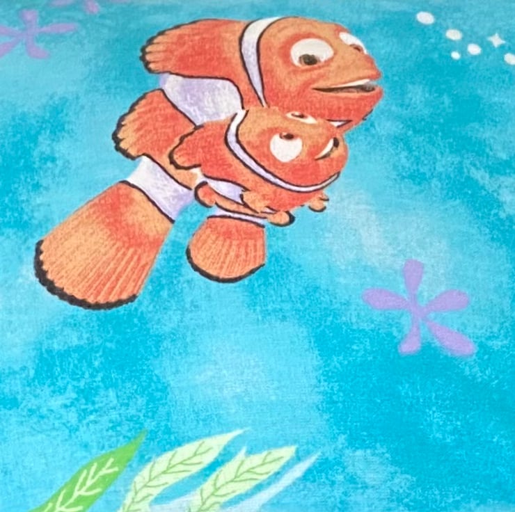 The pocket front is lilac and the fabric is 100% cotton featuring Nemo.