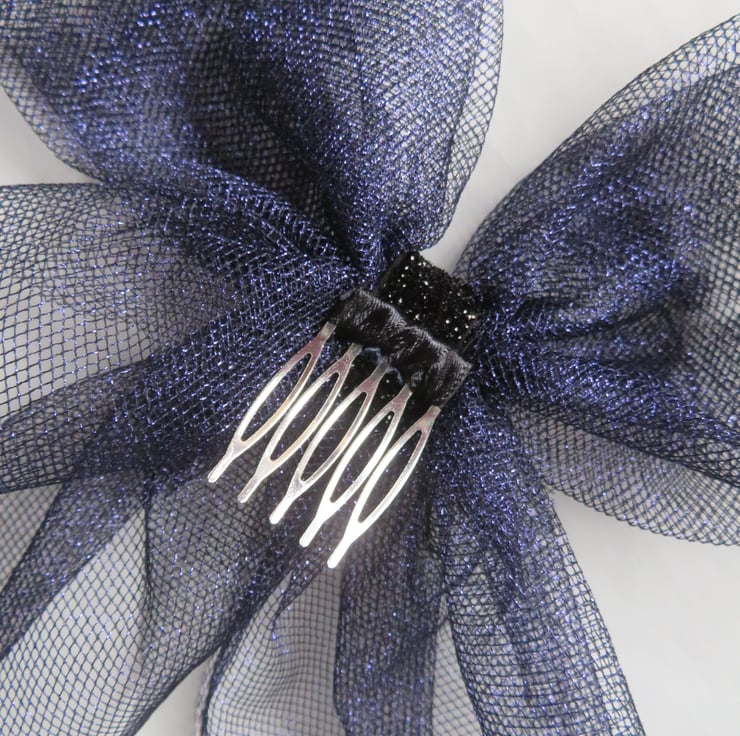 Finished with a black glitter elastic centre and attached into the hair with a small metal comb across the back, which will just push down into the hair, best worn for an updo hair style.