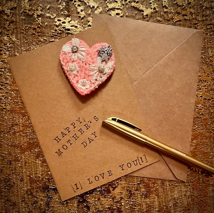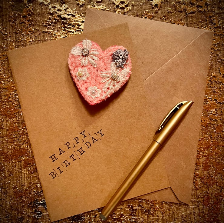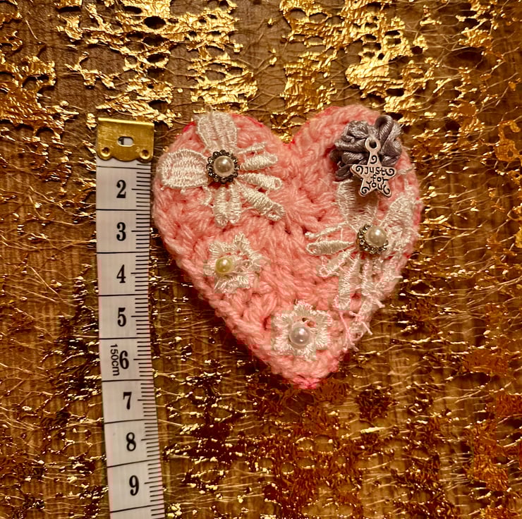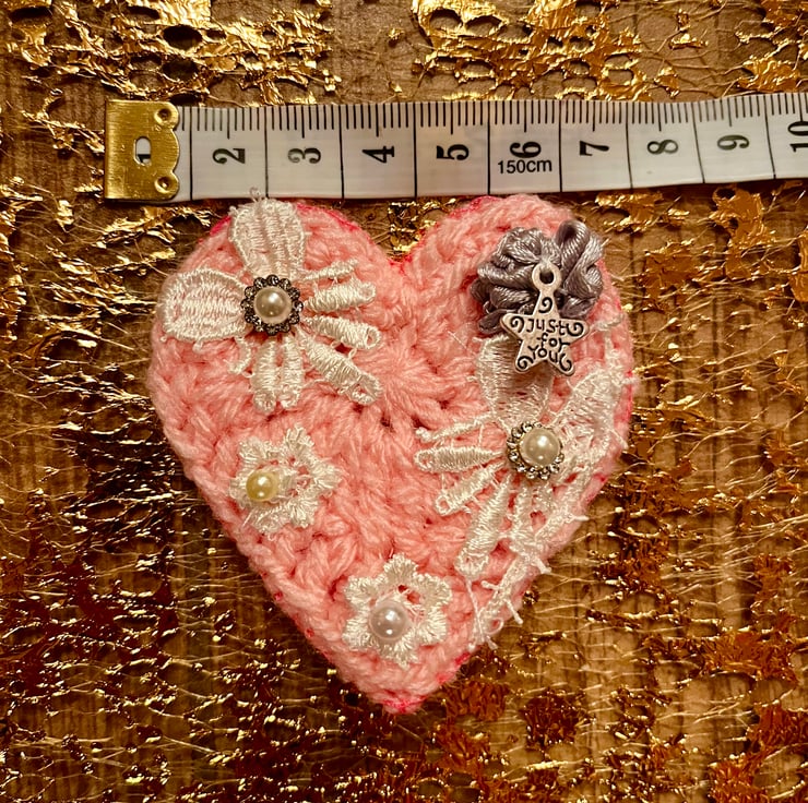 The beautiful keepsake heart shaped brooch is created with a variety of different materials that include a pink crocheted heart front and felt back with a pin back. The delicate embellishments of lace, charms and bows makes this ONE OF A KIND.