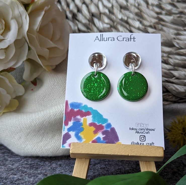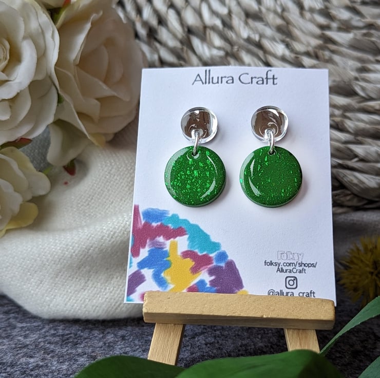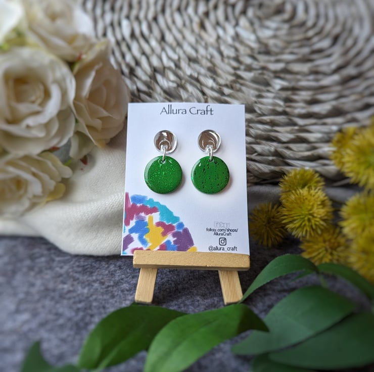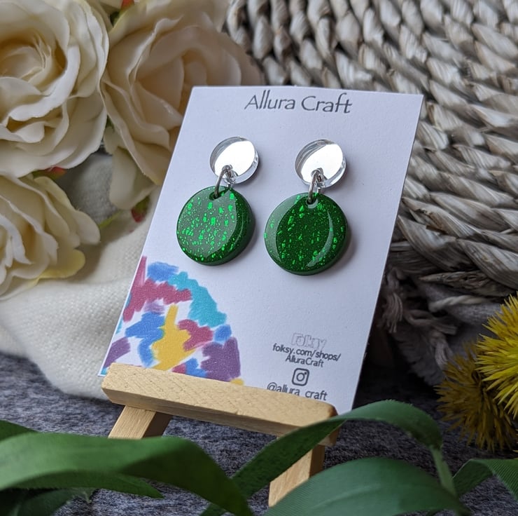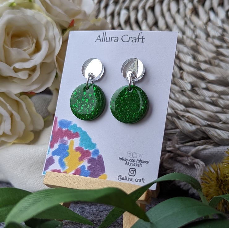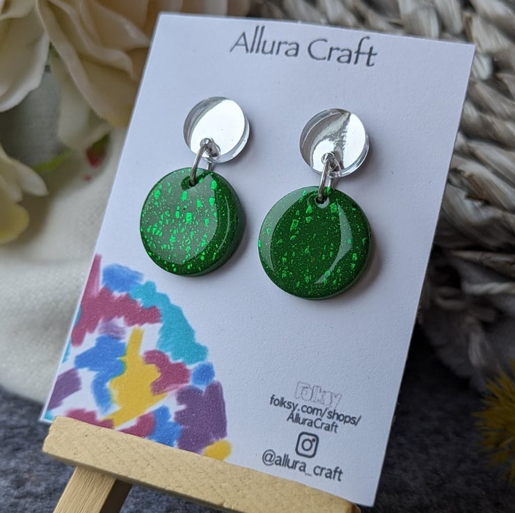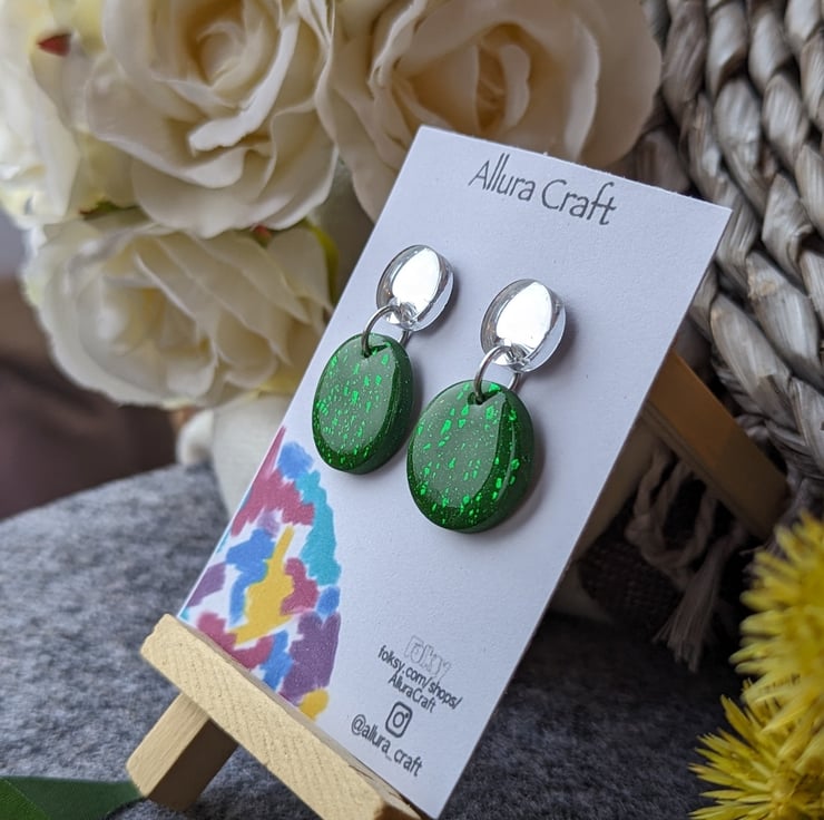 Attached to a larger deep khaki green circle with streaks of green foil leaf for added texture and pop of twinkle
