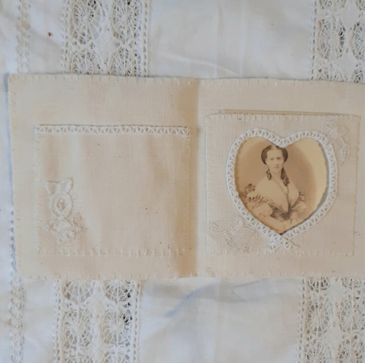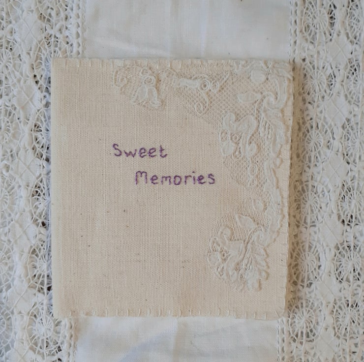 Vintage linen folder entitled 'Sweet memories '. Inside is a pocket for memories and a photo frame. Vintage lace.