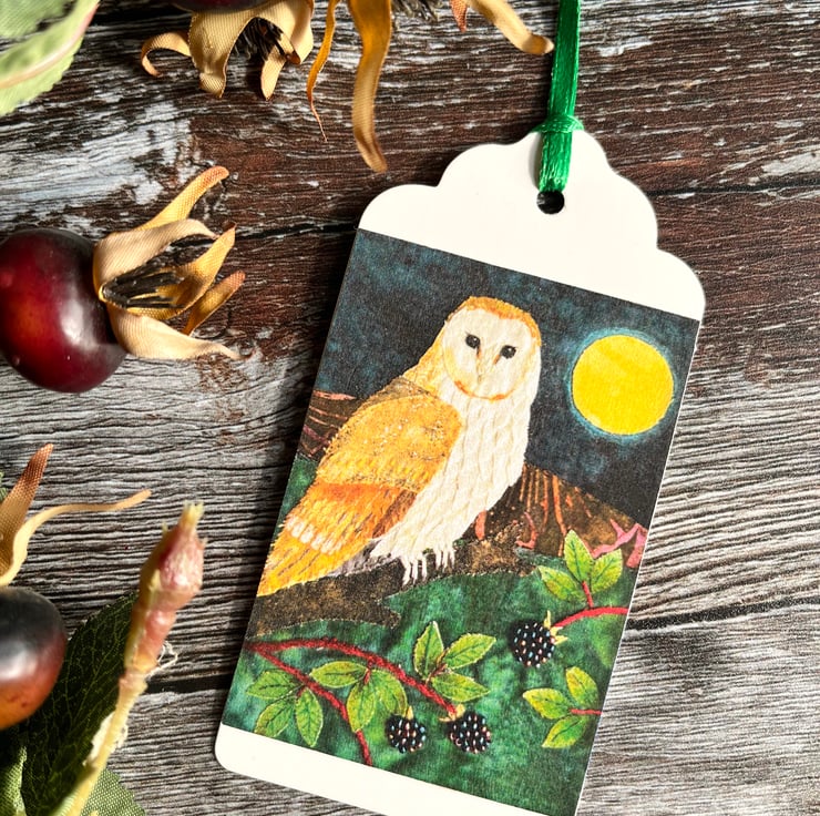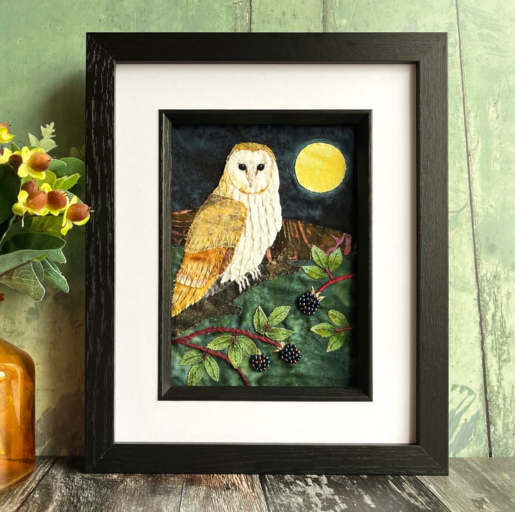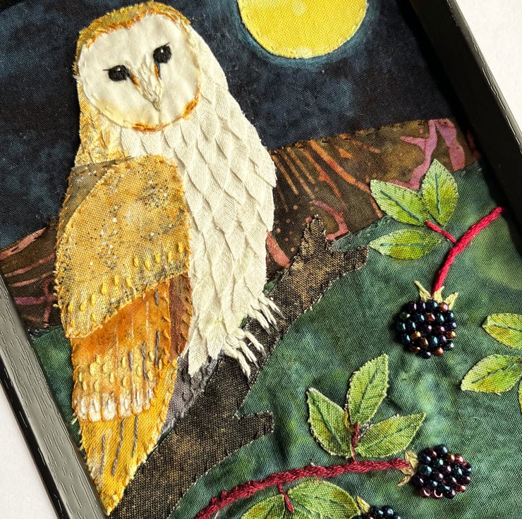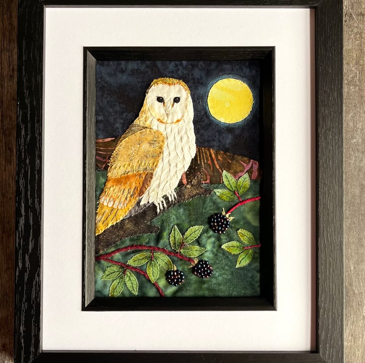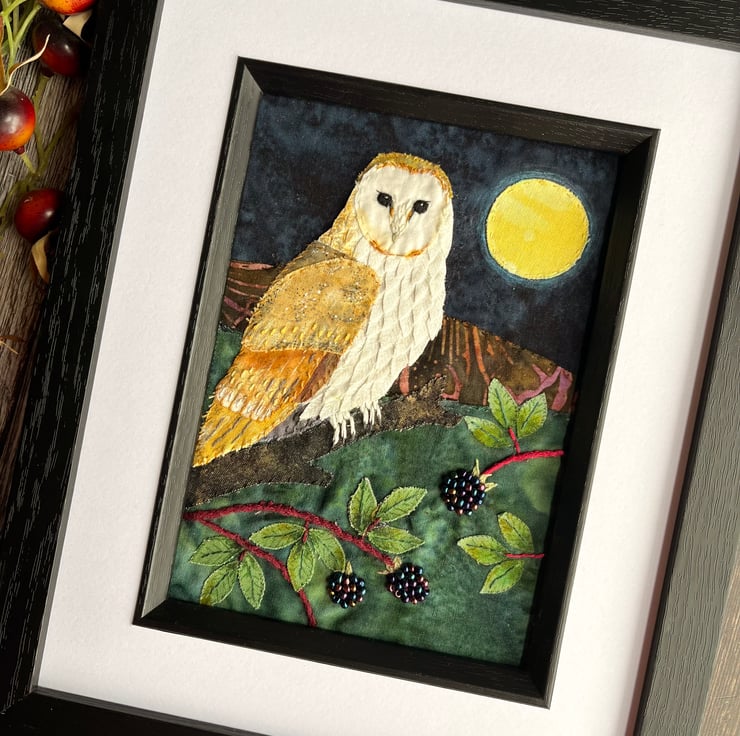 This textile artwork would make a lovely gift for a nature lover. The scene features a barn owl sitting above a hedgerow with ripe blackberries. There are ploughed fields in the background and a full moon is lighting up the night sky.
