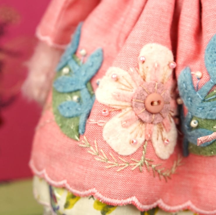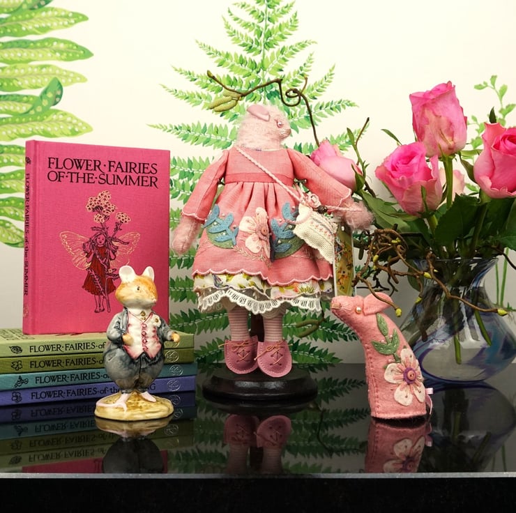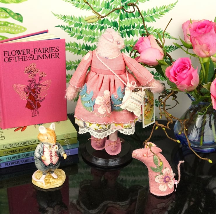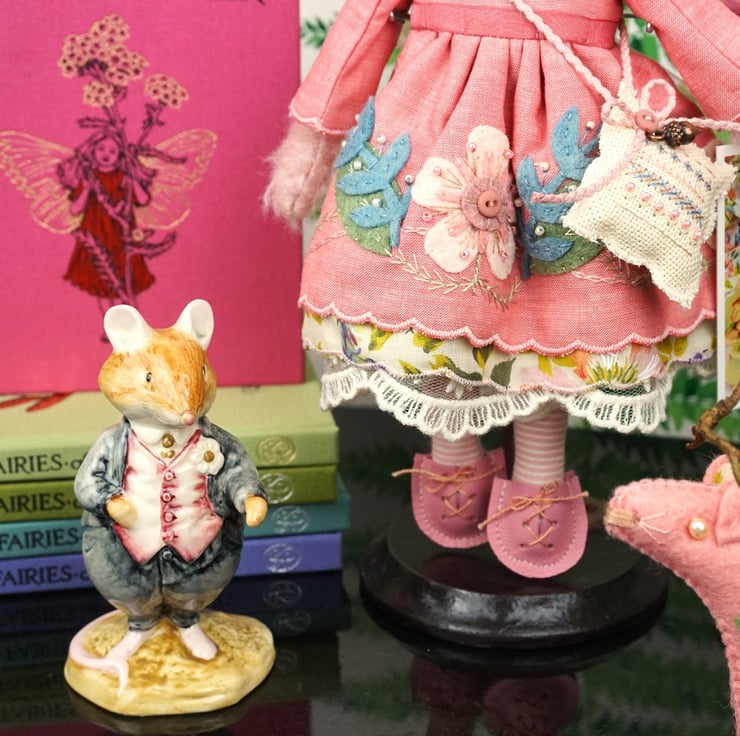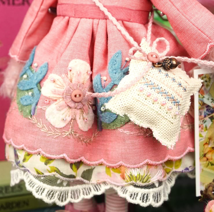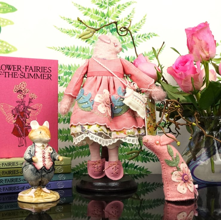 I do love the little mohair mice, Rosaria is named for her rose pink dress and embroidery with a pale pink fur. Smelling gently of roses with a rose crystal to her heart her folk embroidery picks up the colours of her vintage Liberty print underskirts.