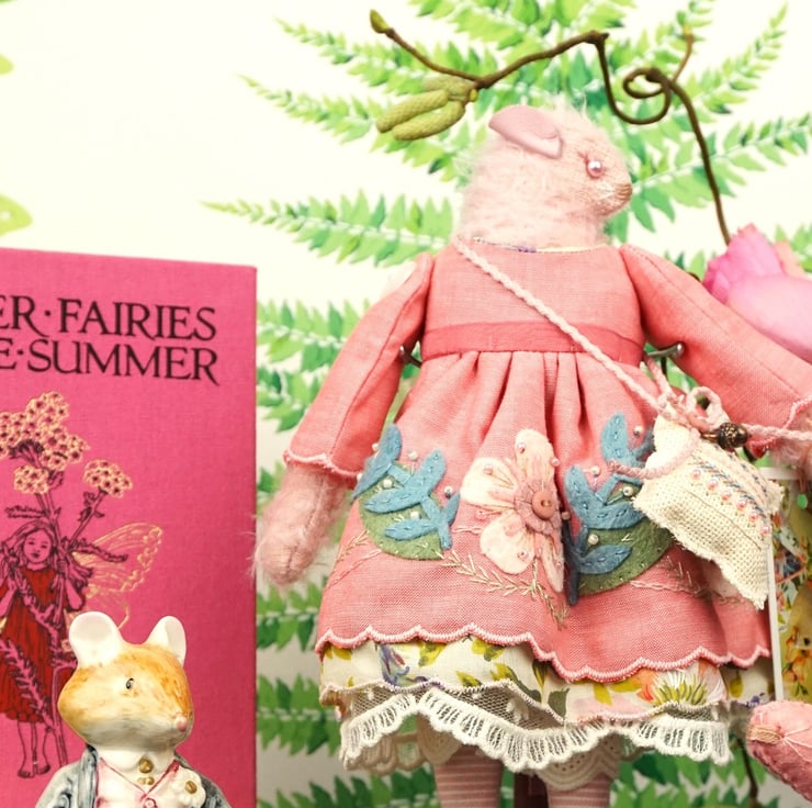 This is a little rose mohair mouse made from Helmbold German Sparse Pink Mohair. Her face is hand embroidered with pale pink beads for her eyes. She is dressed in a pretty hand embroidered dress in soft rose and coral with matching underskirts in Liberty lawn cotton and lace. She has little pink leather ears and a tiny pink leather tail peeping our from her cotton broderie anglais drawers. She is firmly stuffed with rose petals to her stuffing for a gentle scent and with a rose quartz crystal to her heart.