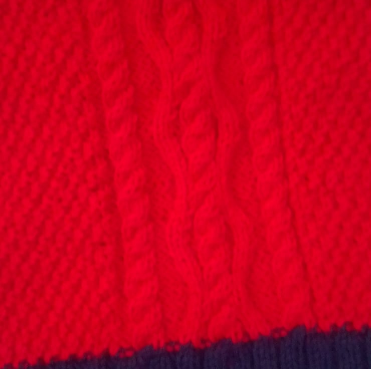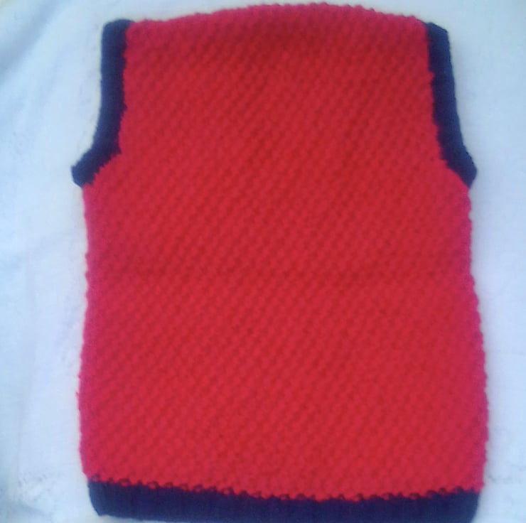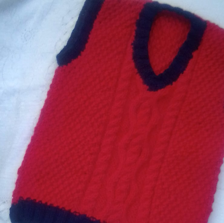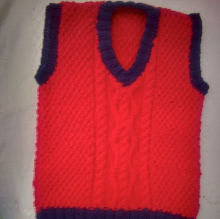 Lovely cable patterned child's sleeveless jumper hand knitted in aran yarn for additional warmth. The slip over design gives an extra layer of warmth without the bulk of the sleeves. It would make an ideal gift for Christmas or a birthday for any young person.