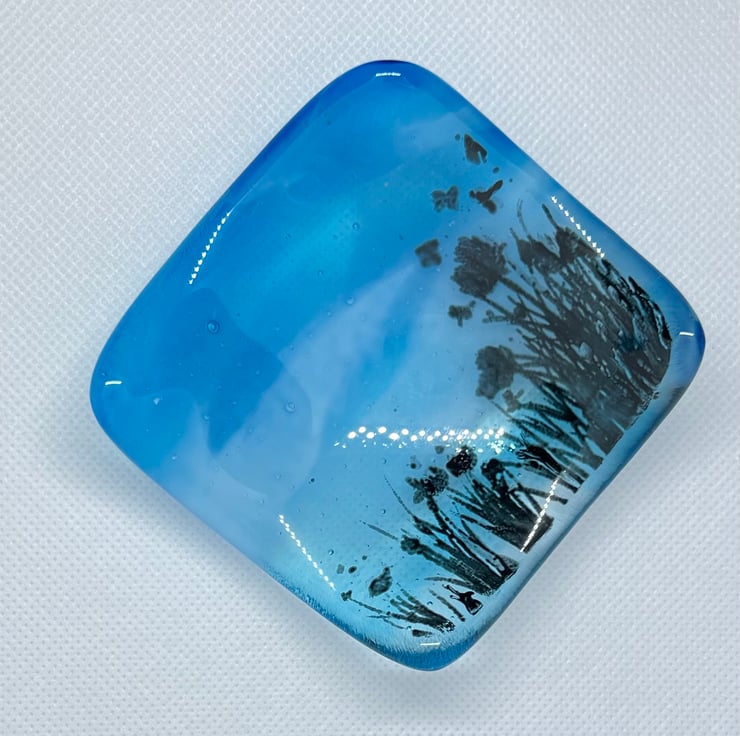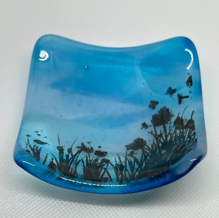 A small fused glass dish, perfect for keeping earrings or rings safe. Meadow flowers are screen printed on to a background of blue and turquoise before being fused and then slumped in my kiln. The dish measures approximately 8cm x 8cm. Postage is included in the price.