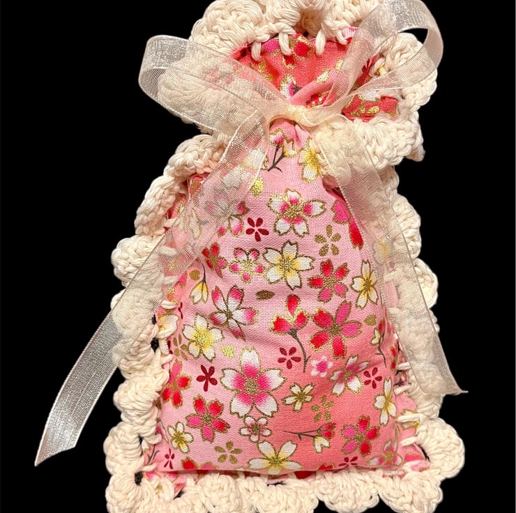 The bag measures 15 cm x 22 cm and includes a ribbon tie.
