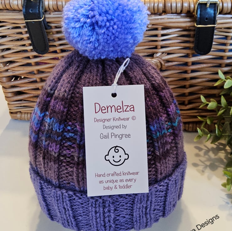 An adorable cosy warm ribbed baby/toddlers beanie hat designed and hand crafted in Cornwall using quality branded premium acrylic yarns. The 8cm pom pom is also hand crafted. A luxury soft damask garment label can be found on the inside back seam with the care instructions woven within it. The hat has a double turned up rim for added protection against the strong winds to protect those delicate ears! A branded Demelza Designs garment swing tag is attached providing a professional finish if gifting.