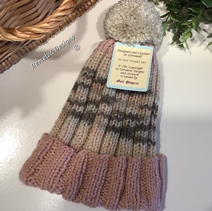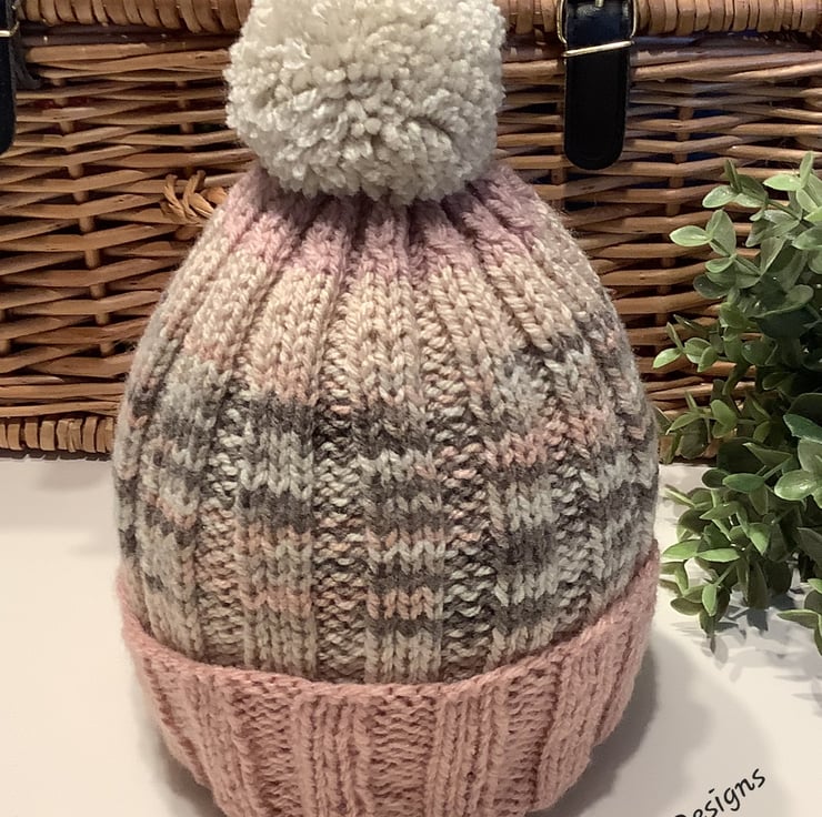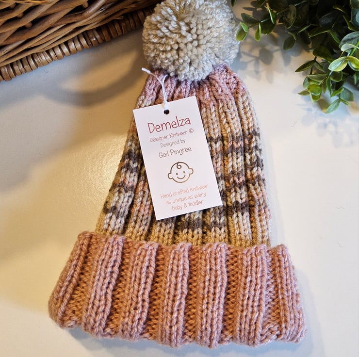 Designer Hand Knitted Girl's Ribbed Large Pom Pom Beanie Hat 2-3 Years size
