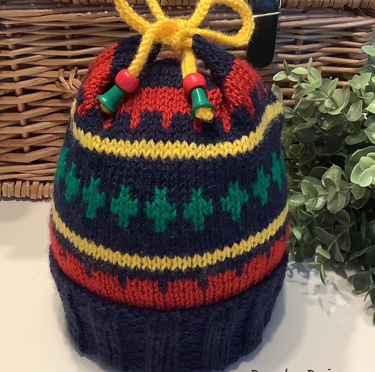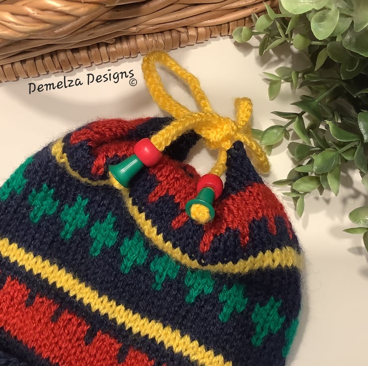 An adorable cosy warm baby/toddler's hat designed and hand crafted using quality branded premium acrylic yarns. The hat has genuine red wooden beads complimented with green toggles. The item is machine washable at a low temperature on a delicate setting. The hat has a double turned up rim for added protection against the strong winds to protect those delicate ears! The hat will come presented with the branded Demelza Designs garment swing tag attached prior to dispatching as proof of it's origins if gifting.