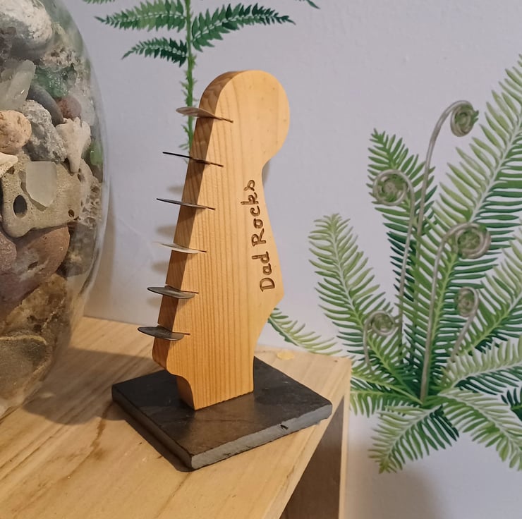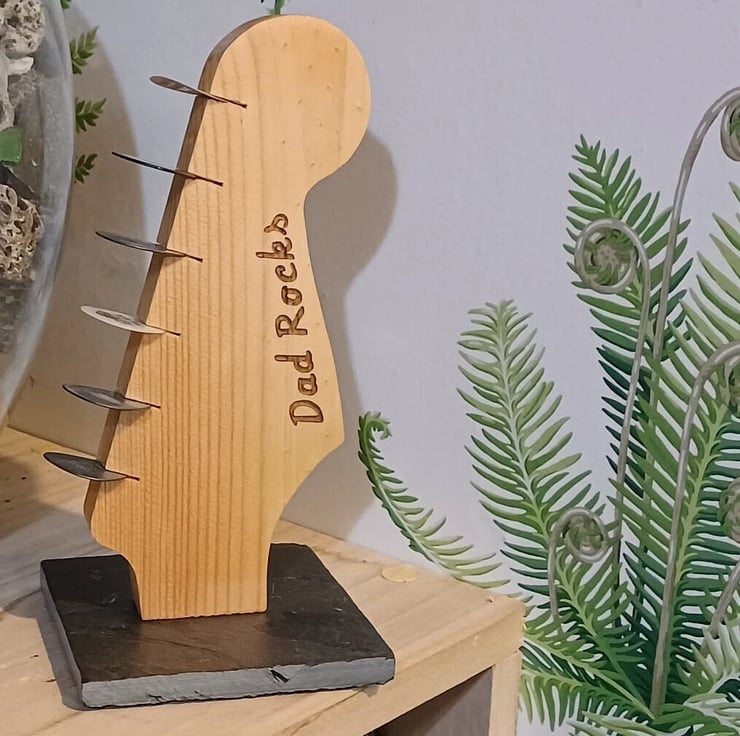 This is our personalised guitar pick holder in the style of a Stratocaster guitar headstock.