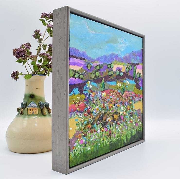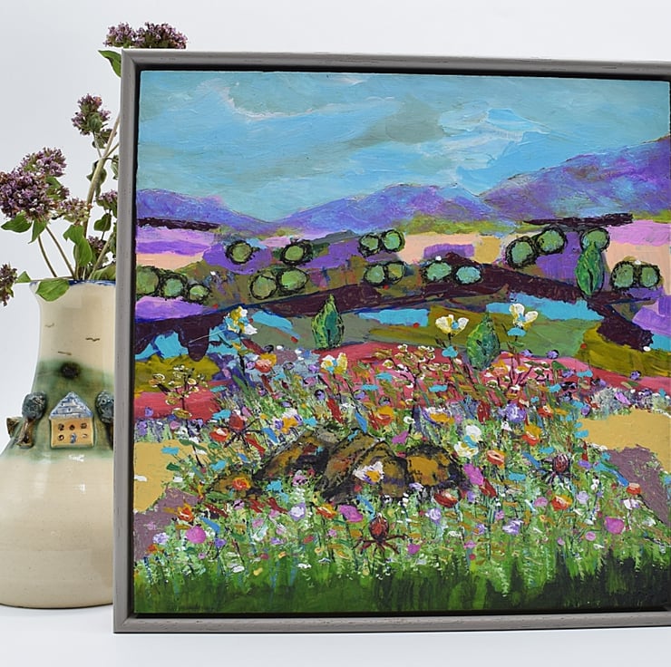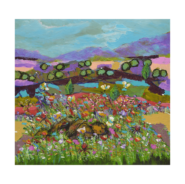 This abstract painting focuses on some basic, solid forms within a landscape, softened by wildflowers in the foreground.
