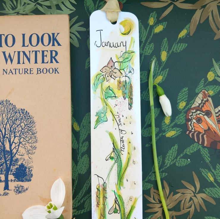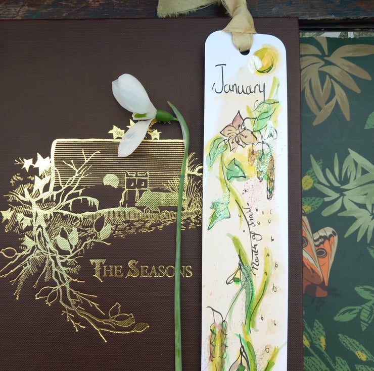 Beautiful illustration on quality card. Hand painted, all individual. Comes thoughtfully wrapped. A small gift for a book lover. This book mark is finished of with a silk trim. ' January month of snow.