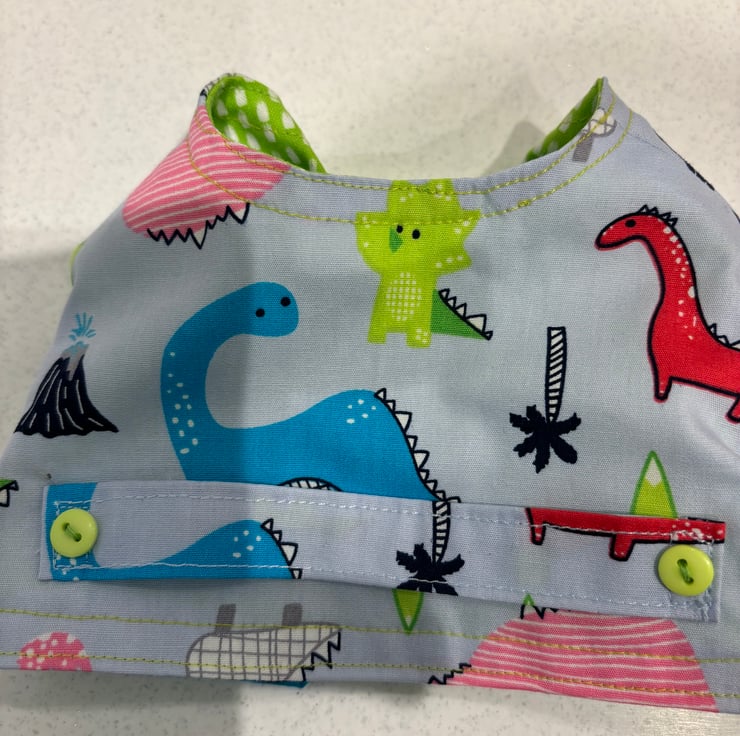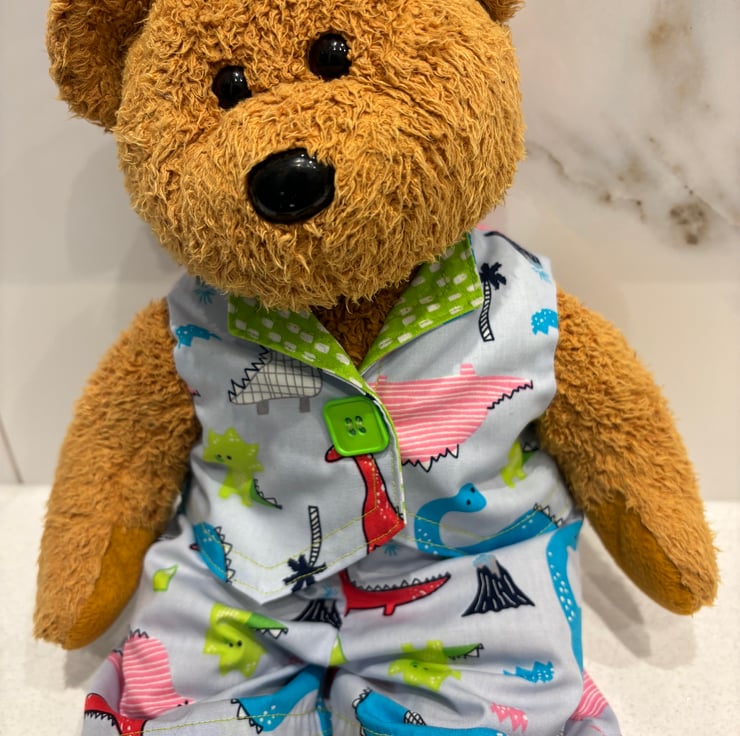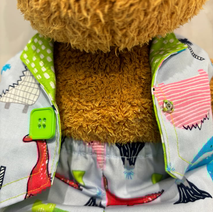 This outfit will fit a teddy approx 13”/34cm tall. Pale blue waistcoat and trousers/ shorts in a colourful dinosaur print. The waistcoat is fully lined in a coordinating lime green print.