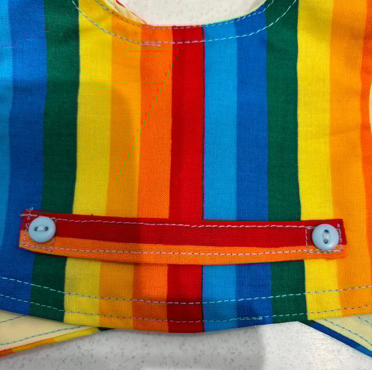 Teddy large size waistcoat to fit a bear approx 19”/48cm tall. A rainbow is how I would describe this waistcoat, colours are bright and fun. Fully lined in yellow. The waistcoat is closed with a button and a snap fastener. Suitable for children over 3 years. Small parts.