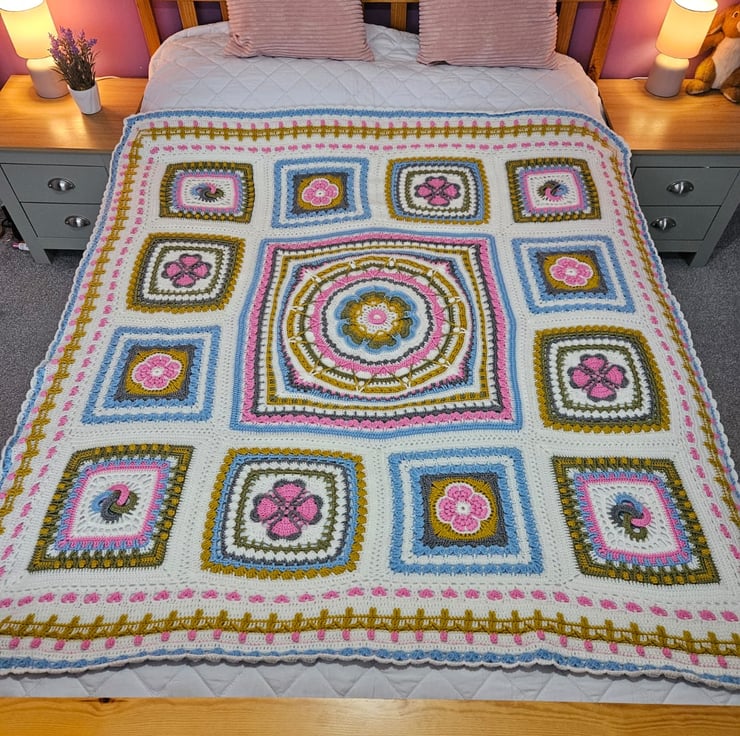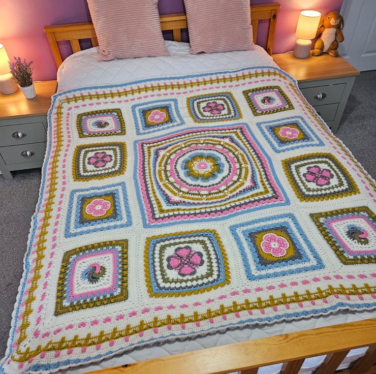 This beautiful crocheted blanket/throw was made by me using 100% premium acrylic yarn. It Is so soft and is lovely and large making it ideal for many uses. This blanket measures approximately 5ft x5ft (150x150 cm) and is photographed on a standard double bed.