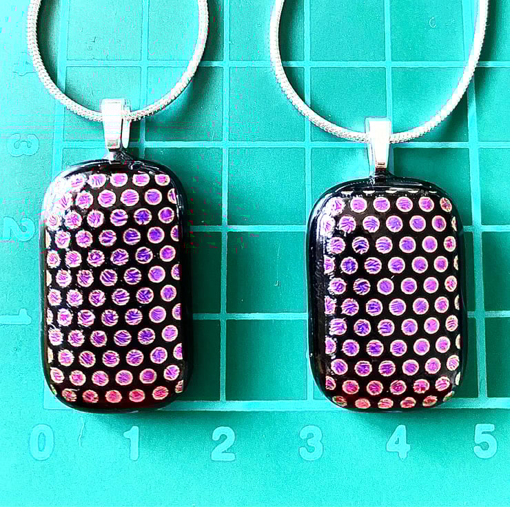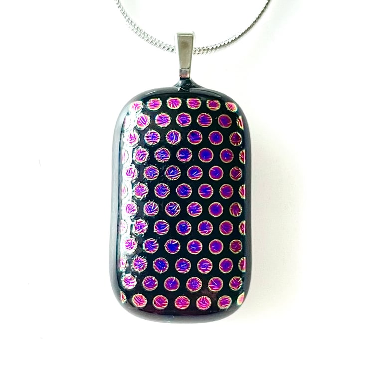 This hand-cut multicoloured glass pendant was made by fusing a layer of polka dot patterned dichroic glass to a black base layer to create this stunning multicoloured shimmering pendant. The shimmer is a matt finish rather than glossy. It was fired at 800 degrees Celsius in a specialist glass kiln and gently cooled over a 12 hour period. A silver plated jewellery bail was glued on to the back to hang it on either a silver plated snake chain or black cord. It measures approximately 26mm across and 27mm high.