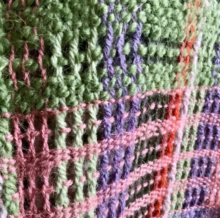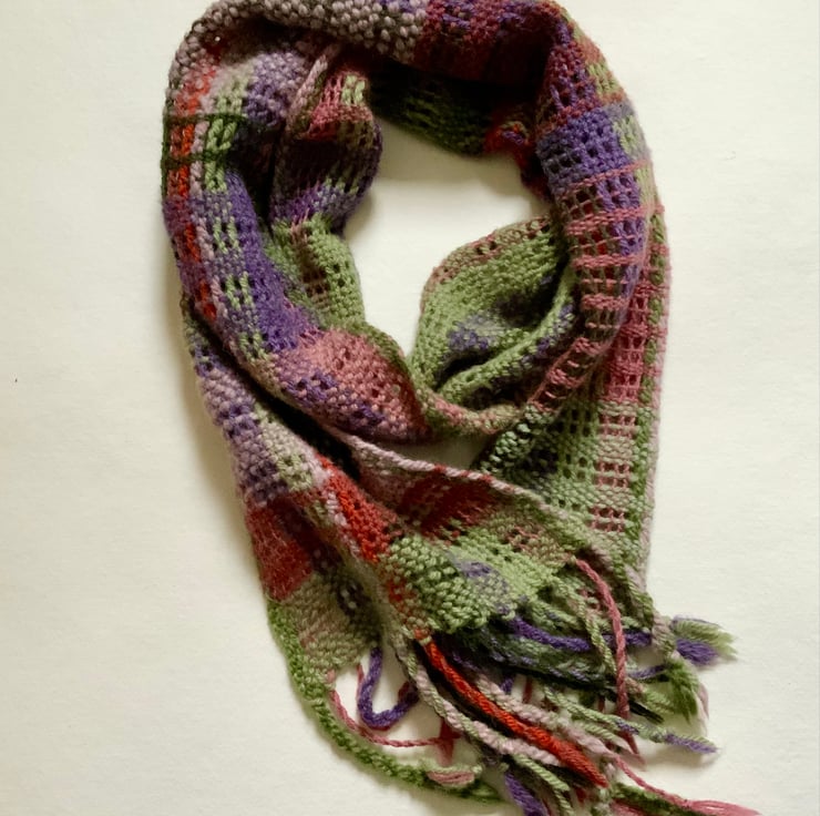 This is a hand woven scarf using pure wool. It’s been woven on my rigid heddle loom and is 165x 20cm wide plus fringe which has been twisted. It is woven in plain weave and Leno which gives a beautiful lacy texture and lovely drape. The colours are green, cinnamon, pink, purple, and peachy oranges. It’s a very pretty scarf and would go with lots of things, perfect for keeping you warm in the colder weather.