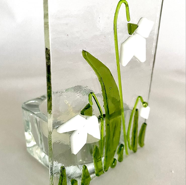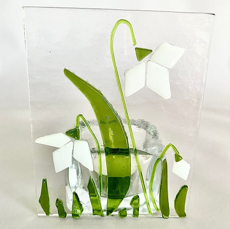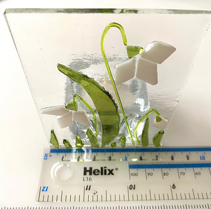 This winter scene of snowdrops was created by fusing hand cut pieces of coloured art glass to a clear base. It was fired to 730 degrees Celsius to a tac fuse which allows the coloured glass to keep its shape and soften the edges rather than fuse into one flat piece.
