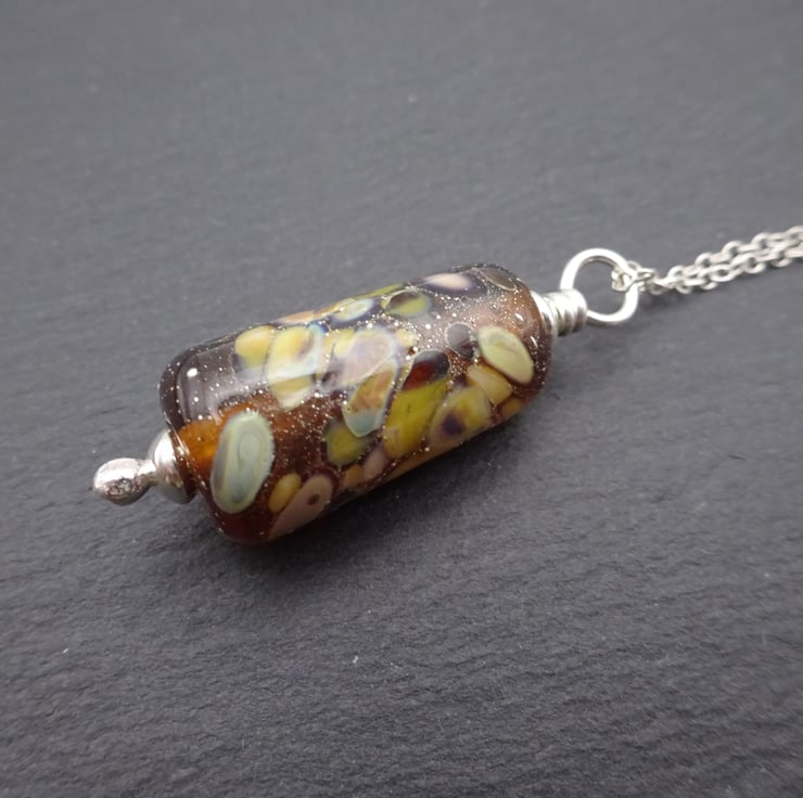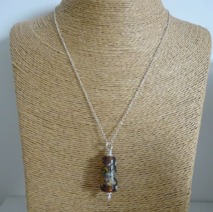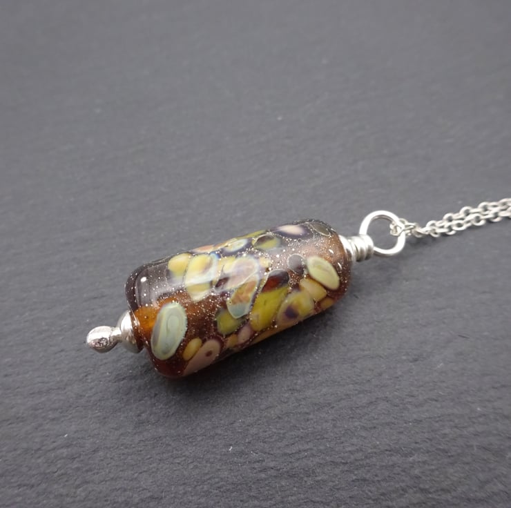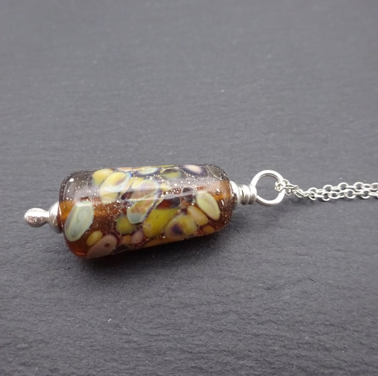 A sterling silver chain which features a handmade lampwork glass pendant made with amber glass and rolled in yellow/brown frit.