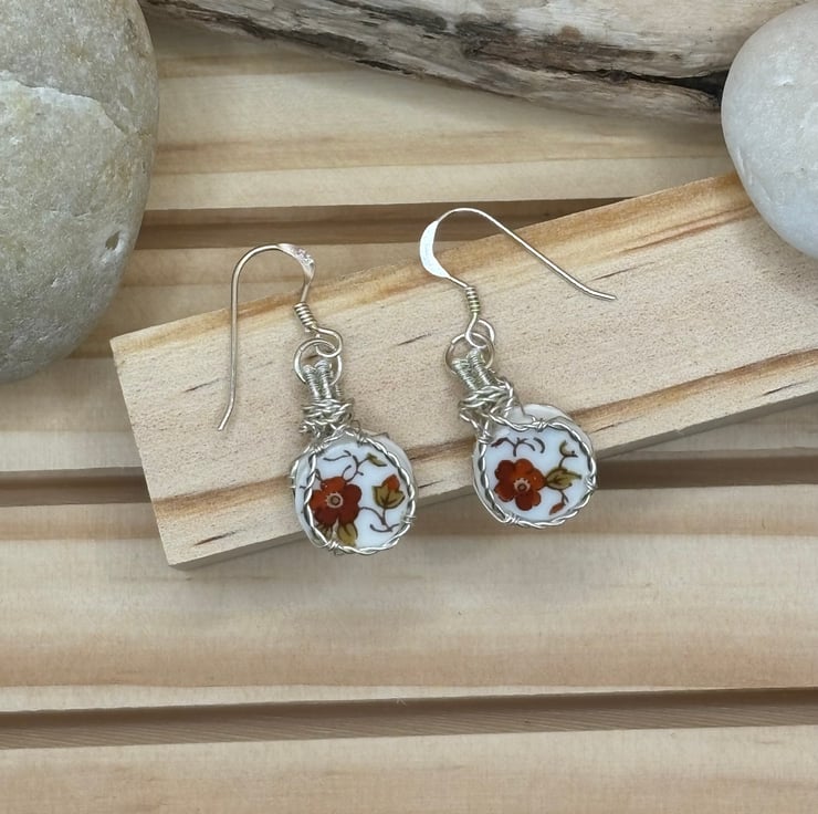 We have made a beautiful pair of earrings using vintage pottery pieces that we have collected. The pottery has a gorgeous design of flowers. The fishhooks are sterling silver. We never drill into the pottery pieces but create a frame and bail to encase it. We think these are so unique and will get lots of attention when worn.