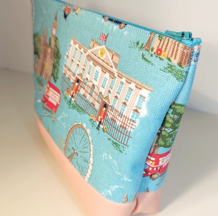 Cosmetic/make up bag made in Cath Kidston London Scene fabric. The bottom of the bag is made with pink vinyl to make it more sturdy. it is fully lined and closes with a zip.